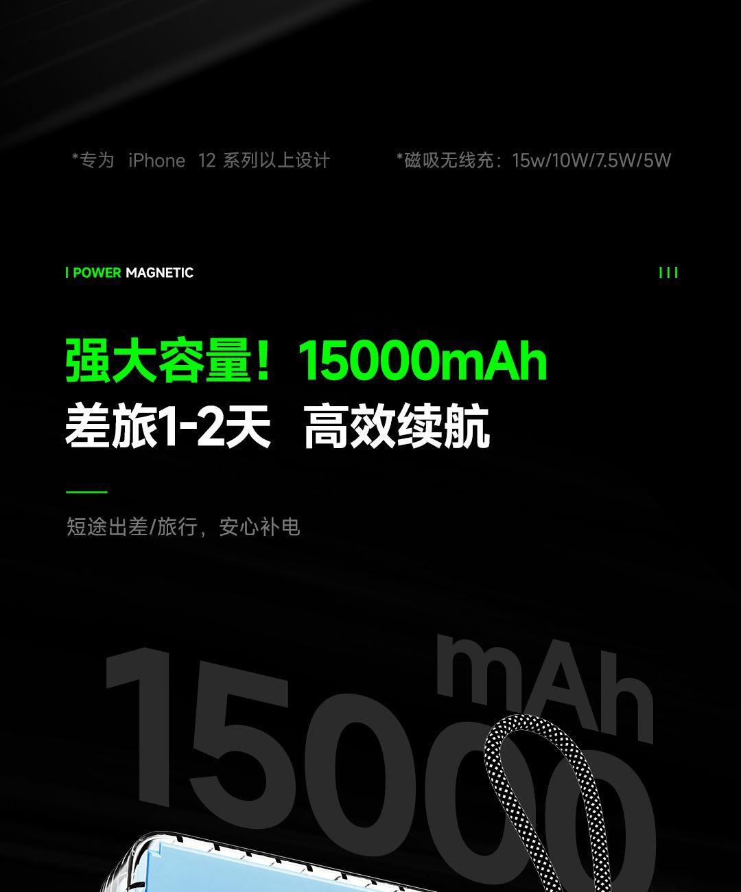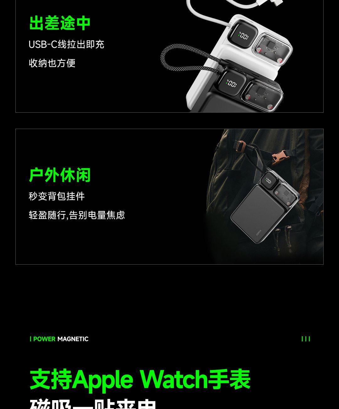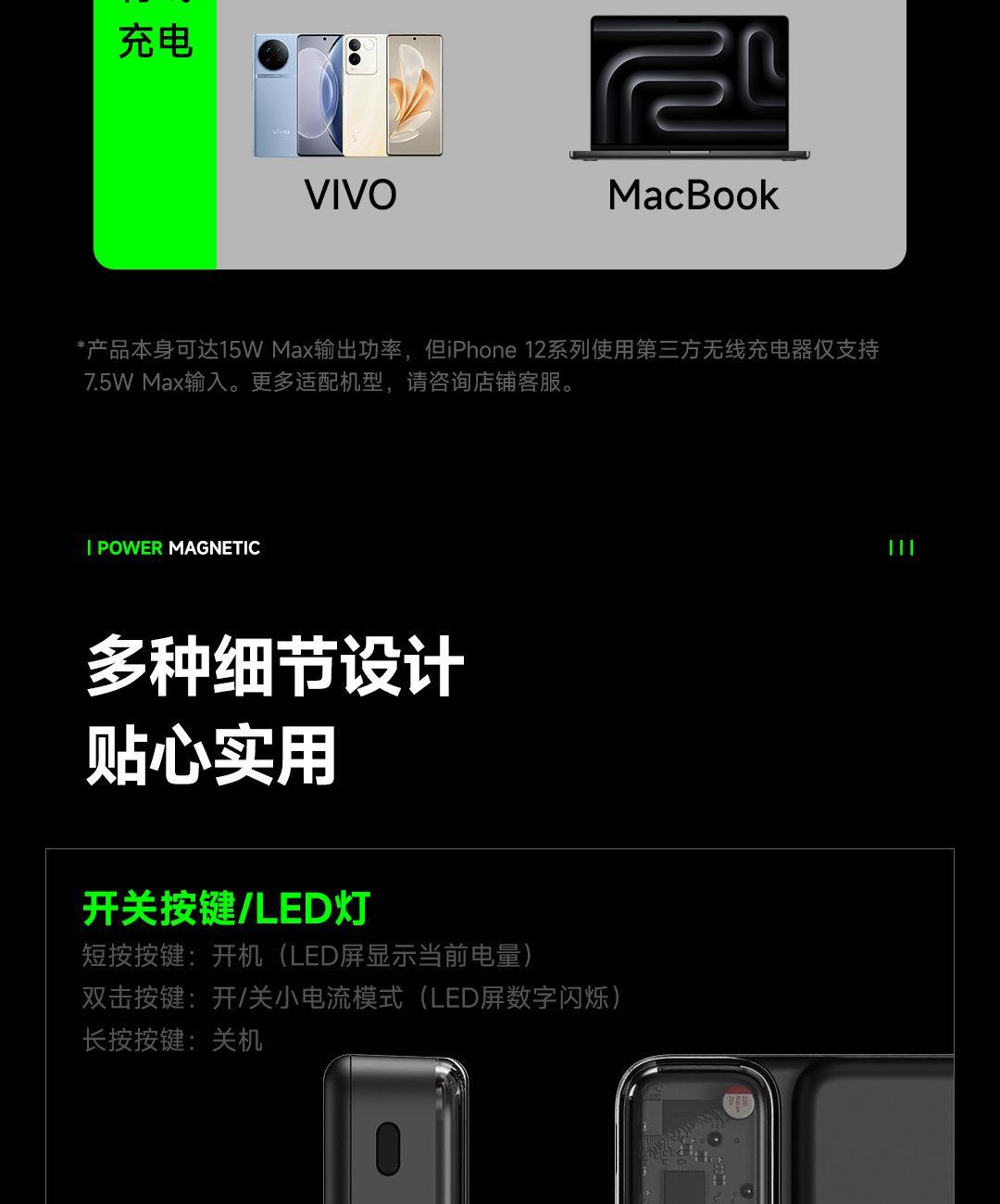 無(wú)線充輸出功率可達(dá)15W,磁吸無(wú)線充模式兼容iWatch手表系列充電,大大提高了無(wú)線充電的體驗(yàn)感