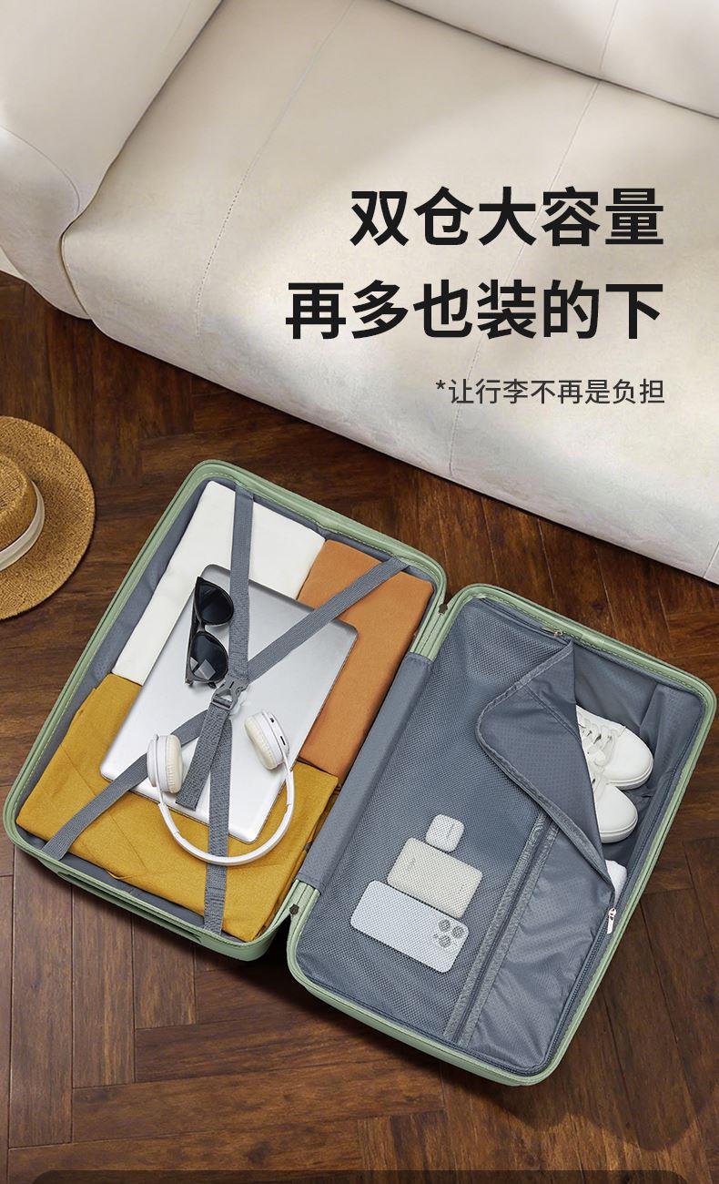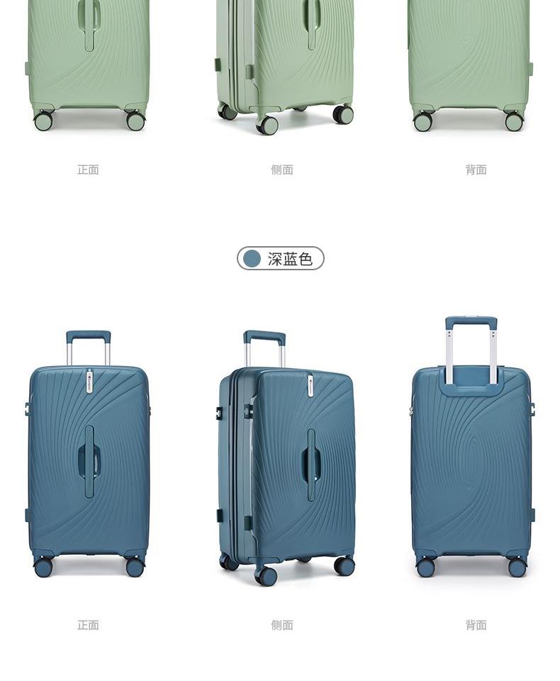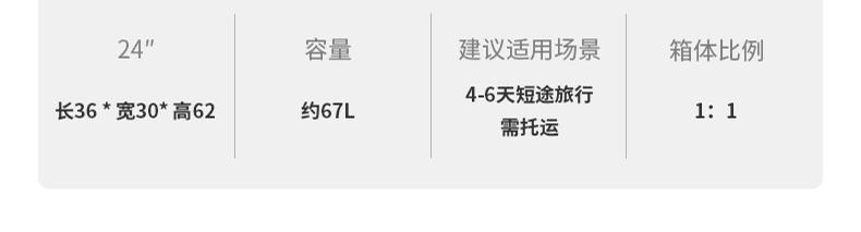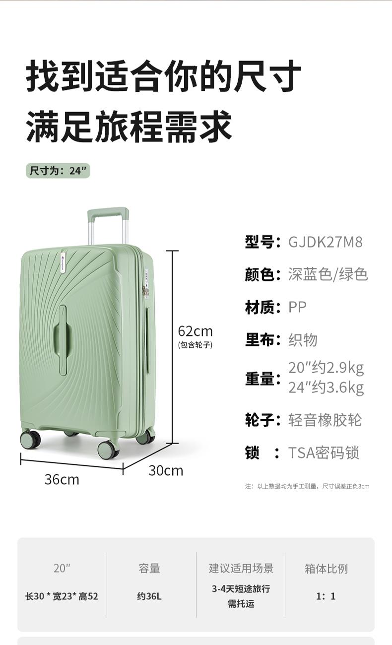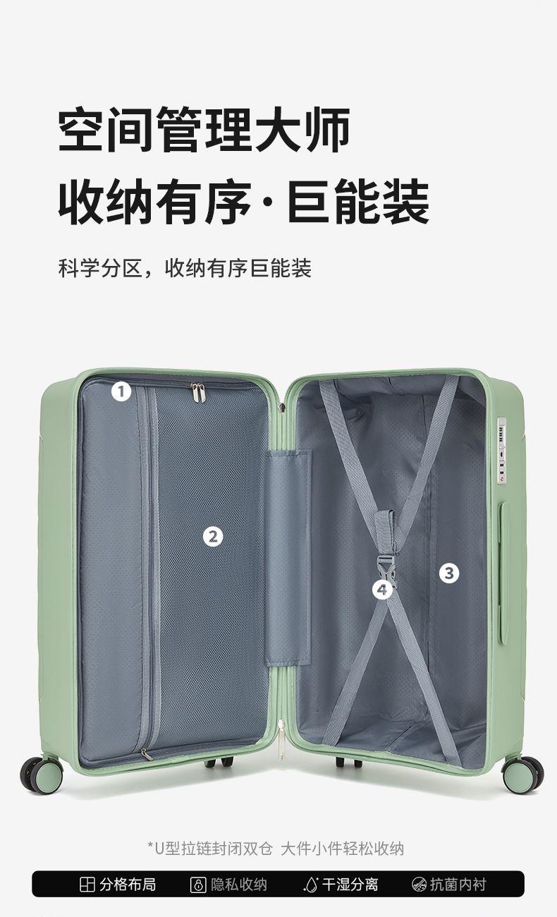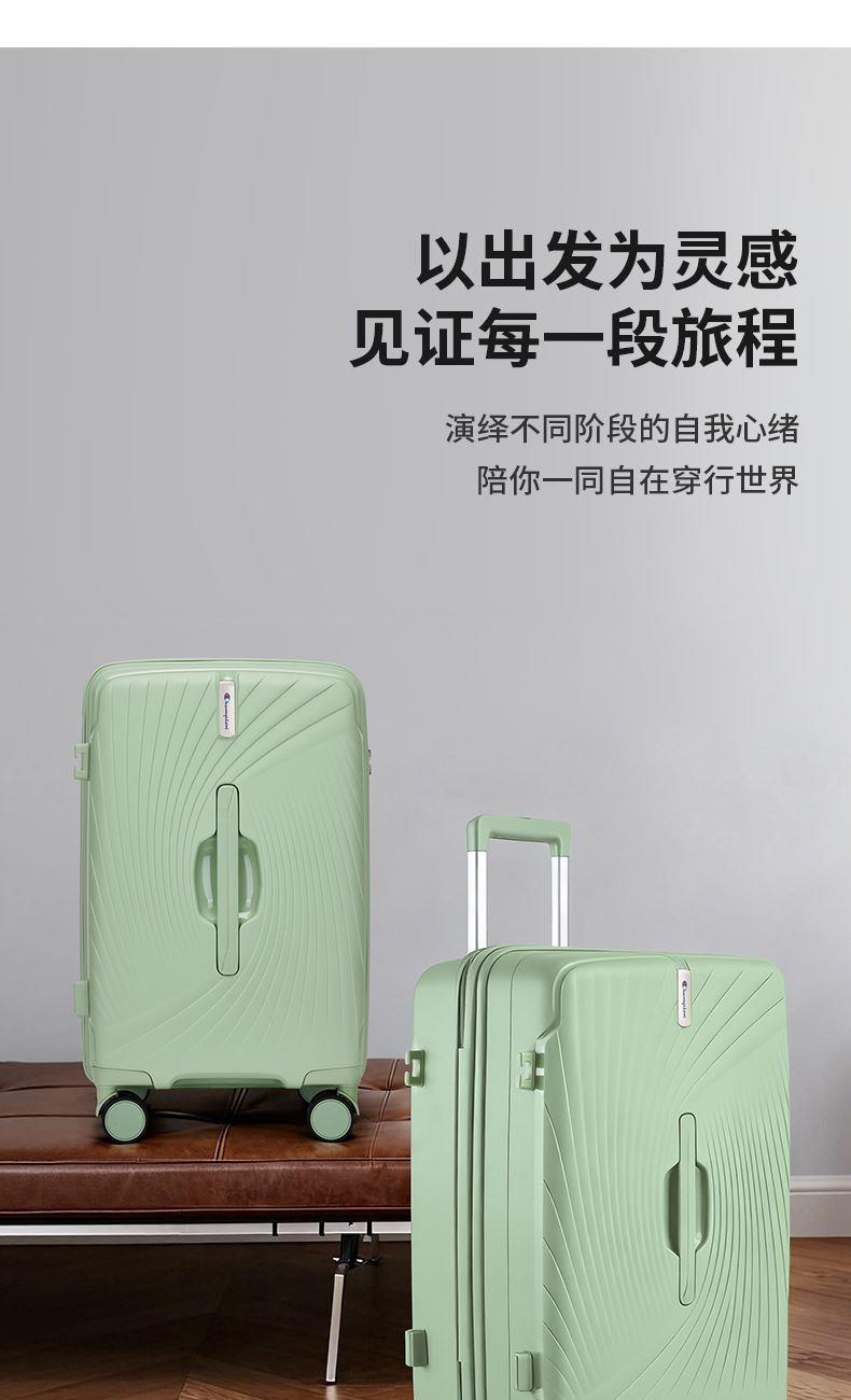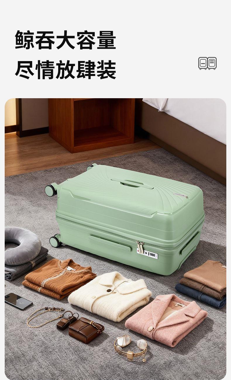 材質(zhì):面料:PP,里料:織物 尺寸:24寸 特點(diǎn):容量與靈活的平衡之選 顏色分類:深藍(lán)色/綠色 外箱尺寸:380*315*660mm 吊牌價(jià):1190元 適用場(chǎng)景:國(guó)內(nèi)長(zhǎng)假、短期留學(xué) 上市時(shí)間:2025年秋季 類別:行李箱 適用人群:男女通用