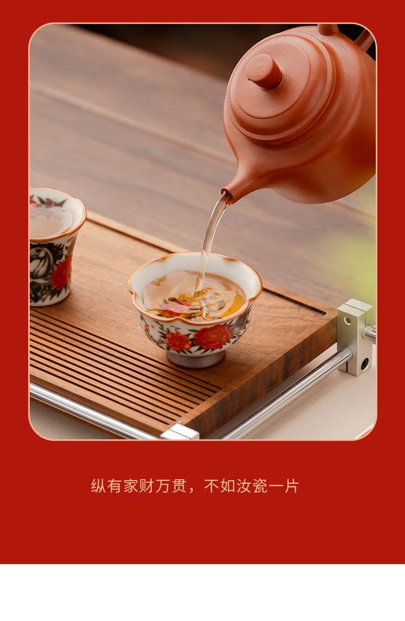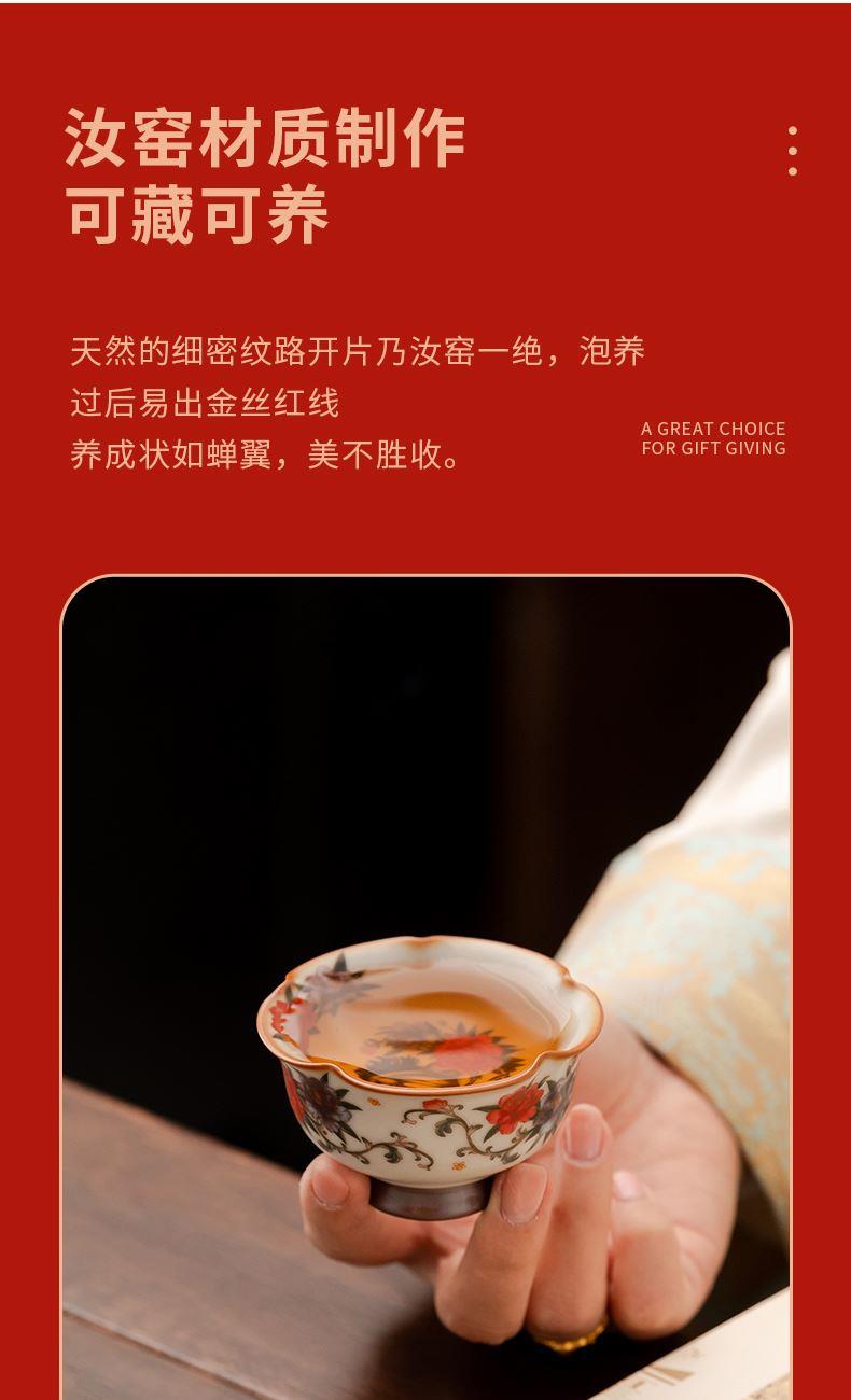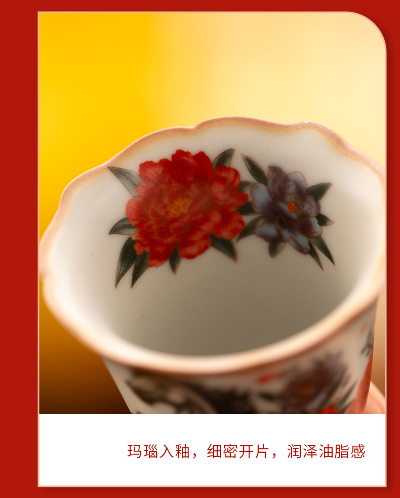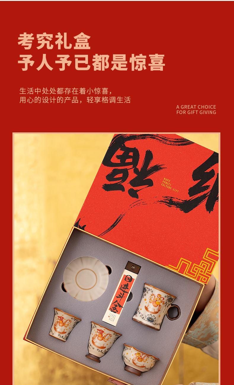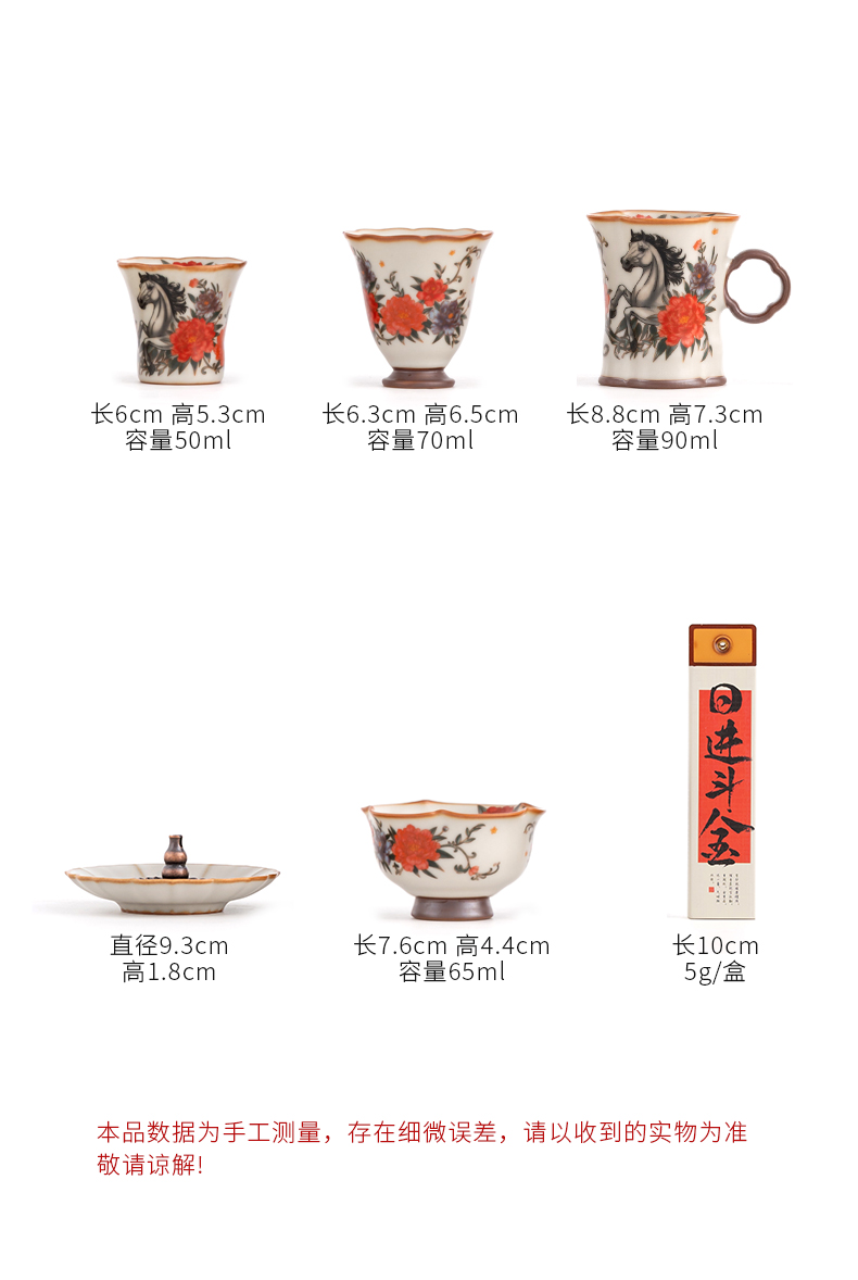 配 制:1手柄杯 1聞香杯 1小杯 1碗 1香盤 1線香 1收藏證書 1禮盒 手提袋 材質(zhì):汝黃瓷 檀香 規(guī)格:手柄杯 6*9cm 聞香杯6.5*6.3cm 小杯6*5.3cm 碗7.6*4.4cm 香盤9.3*1.8cm 容量:手柄杯70ml 推薦說明:馬年開門紅禮品,馬上有錢,馬到成功杯子套裝,配日進斗金線香,帶香插蓮花香盤。亞黃汝瓷,瑪瑙入釉,蟬翼開片,內(nèi)外皆有花面,家有千財萬貫,不如汝窯一片。技術(shù)新品。畫面堆料技術(shù),富有立體浮雕質(zhì)感,真實感強。杯身開片,可養(yǎng)瓷。