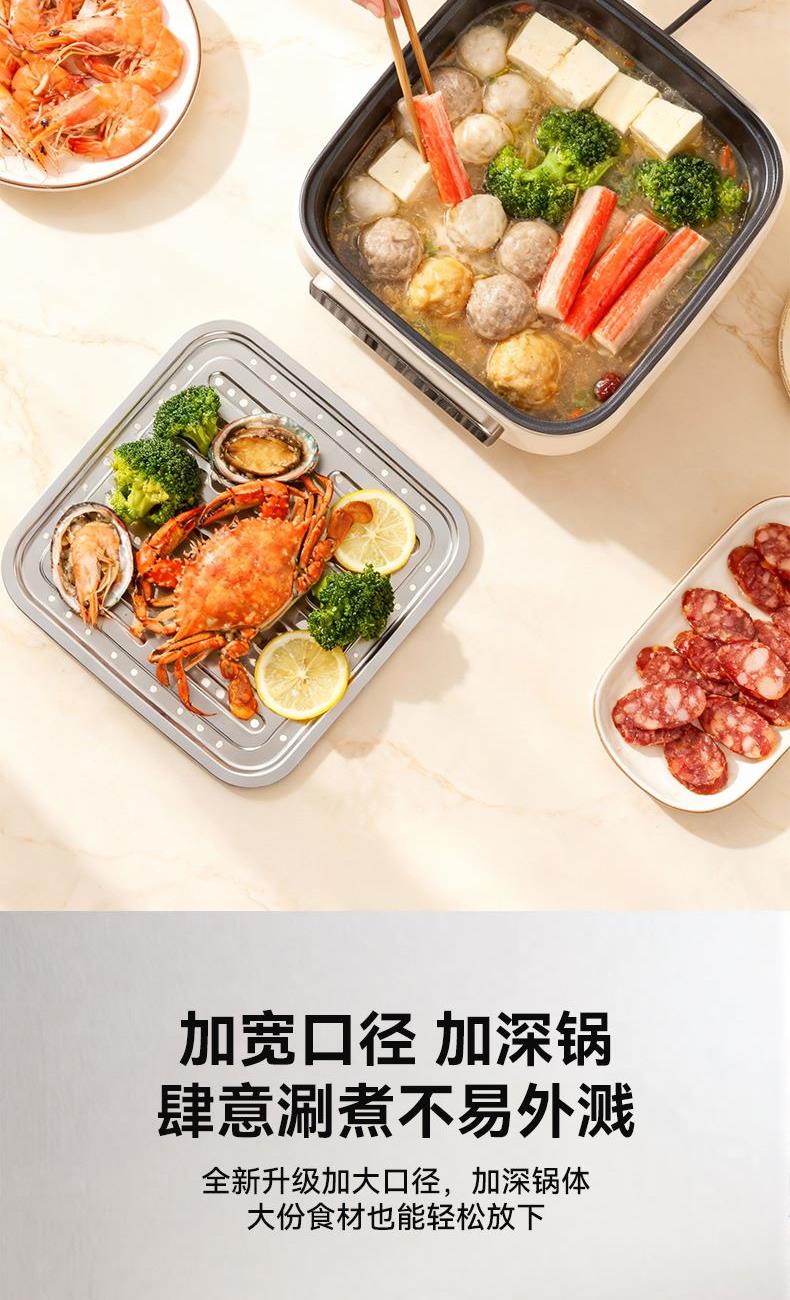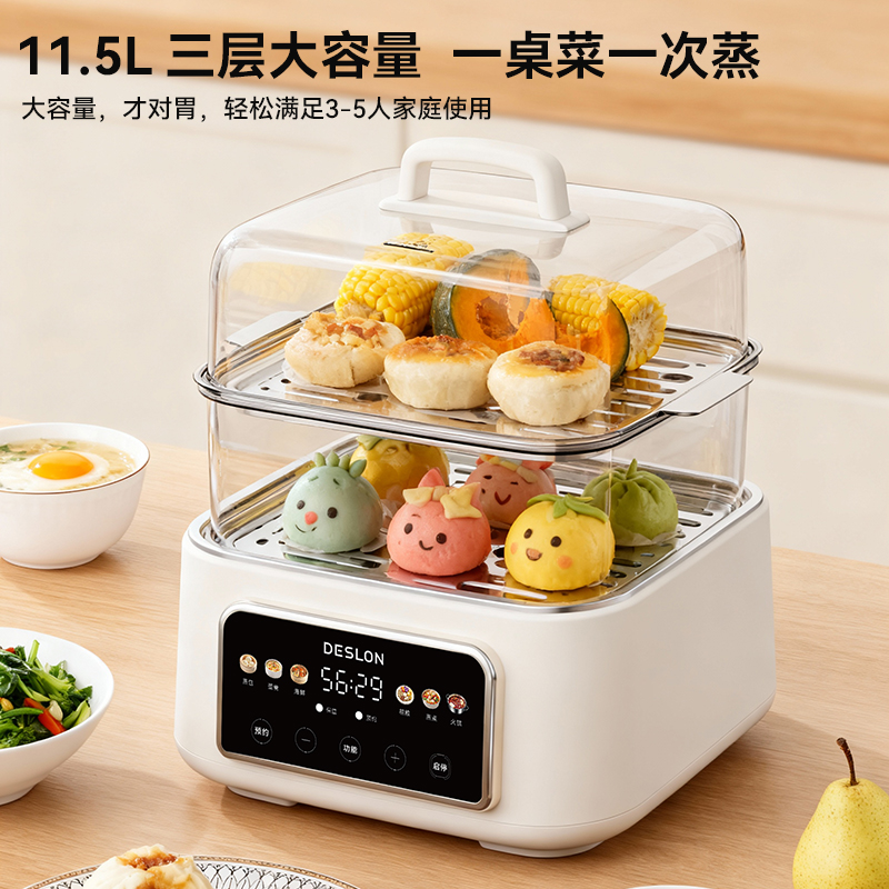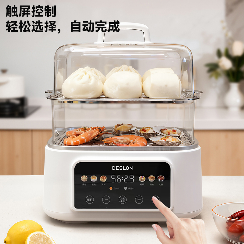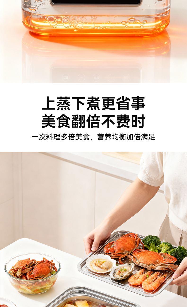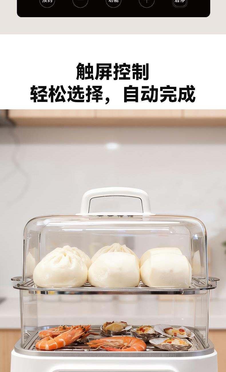 額定電壓:220V~ 額定頻率:50Hz 額定功率:1500W 容 量:11.5L 控制方式:觸控式微電腦程序控制 主要材質(zhì):304不銹鋼+PP+PC 產(chǎn)品凈重:1.8kg 產(chǎn)品尺寸:278*280*300mm 彩盒尺寸:332*305*343mm 1、可視化PC蒸格配合304不銹鋼鍋膽,蒸煮兩用; 2、雙層4L+4L蒸格隨心搭配,滿足多人使用; 3、火鍋容量3.5L,1500W大功率加熱,快速沸騰; 4、配置24小時(shí)預(yù)約功能,設(shè)定時(shí)間,無需看管; 5、內(nèi)置安全保護(hù)裝置,干燒超溫自動斷電。