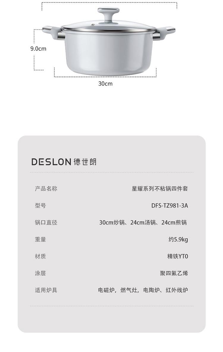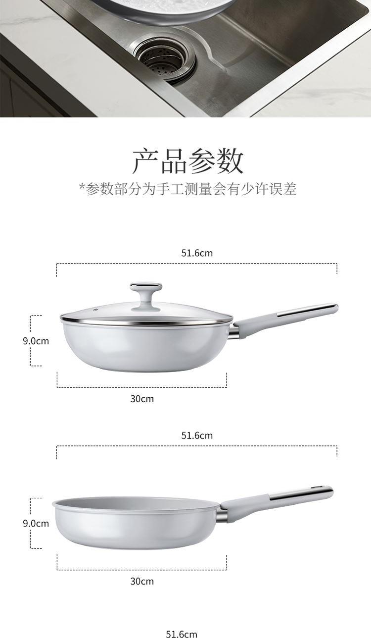 產(chǎn)品配置:30cm炒鍋、24cm湯鍋、24cm煎鍋