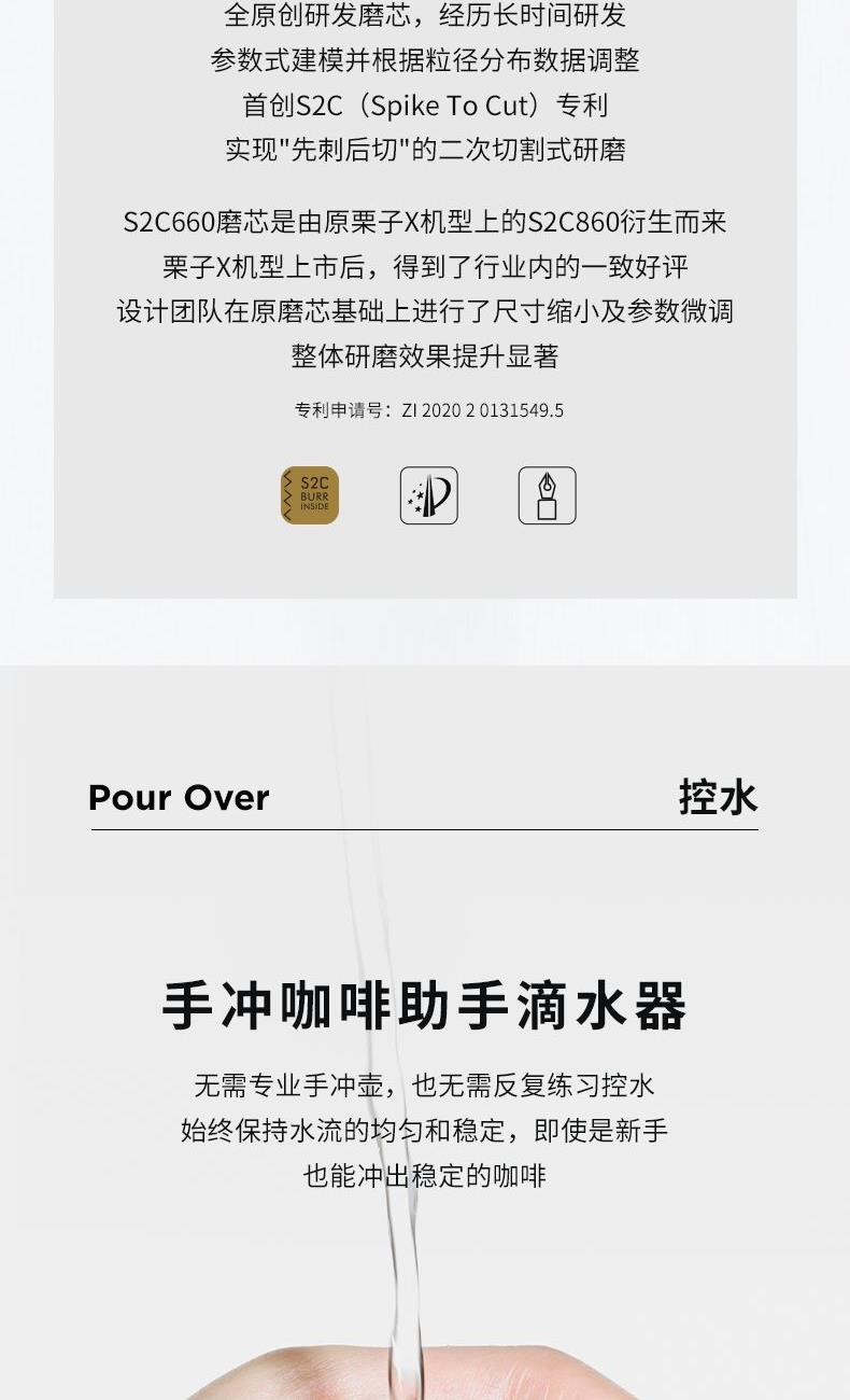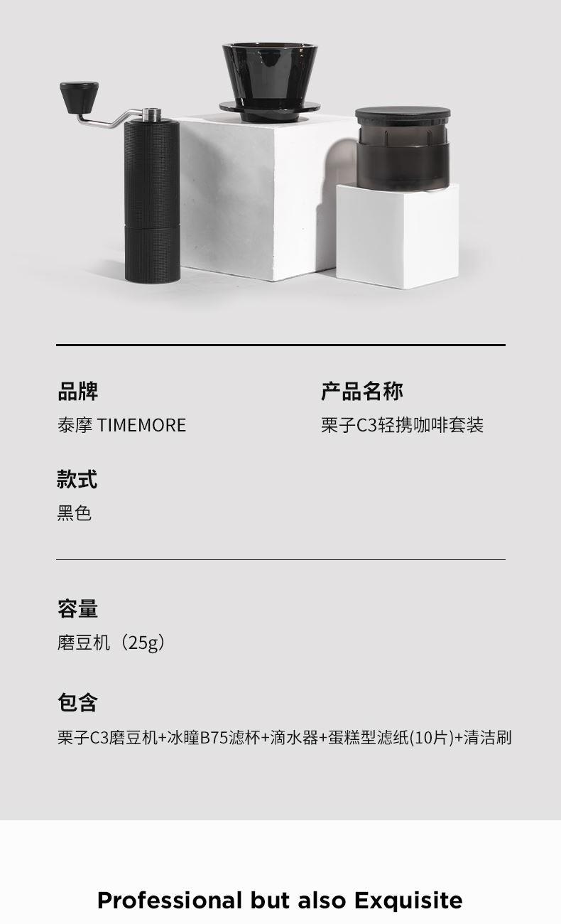 產(chǎn)品:栗子C3輕攜咖啡套裝 款式:黑色 容量:磨豆機(25g) 磨豆機尺寸 機身:147mm×52mm 手柄:159mm 磨豆機磨芯:原創(chuàng)S2C660磨芯 包含: 栗子C3磨豆機+冰瞳B75濾杯+滴水器+蛋糕型濾紙(10片)+清潔刷 說走就走 咖啡隨行 到哪都能喝到咖啡旅行咖啡套裝