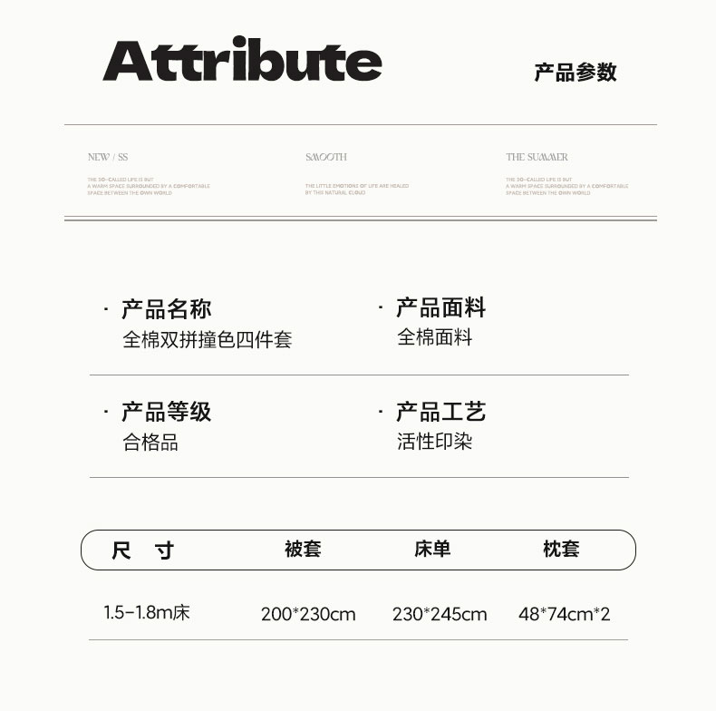 被套:200×230cm 床單:230×245cm 枕套:48×74cm 適用:1.5M-1.8M床 面料:棉 風(fēng)格:輕奢風(fēng)格 包裝:精美天地蓋禮盒 套件整體奢華感與儀式感并存空間質(zhì)感瞬間升級(jí) 不經(jīng)意間彰顯出主人的優(yōu)雅品質(zhì)期待與你共赴一場(chǎng)生活美學(xué)之約。