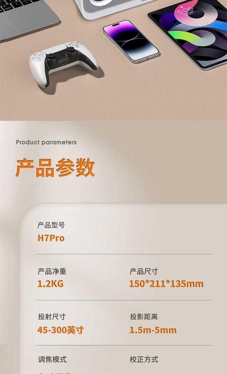產(chǎn)品型號(hào):H7Pro 產(chǎn)品凈重:1.2KG 投射尺寸:45-300英寸 調(diào)焦模式:電動(dòng)調(diào)焦 產(chǎn)品尺寸:150*211*135mm 投影距離:1.5m-5mm 投影方式:桌面正投/桌面背投