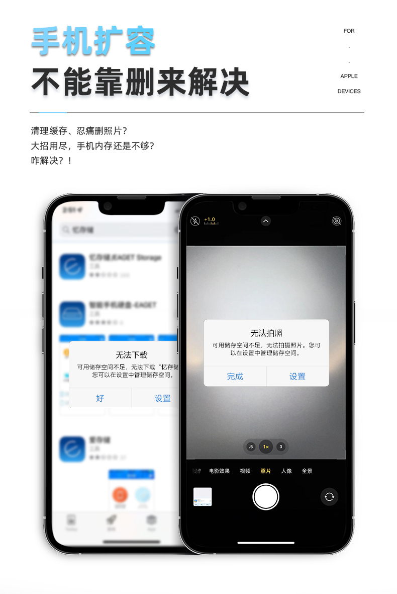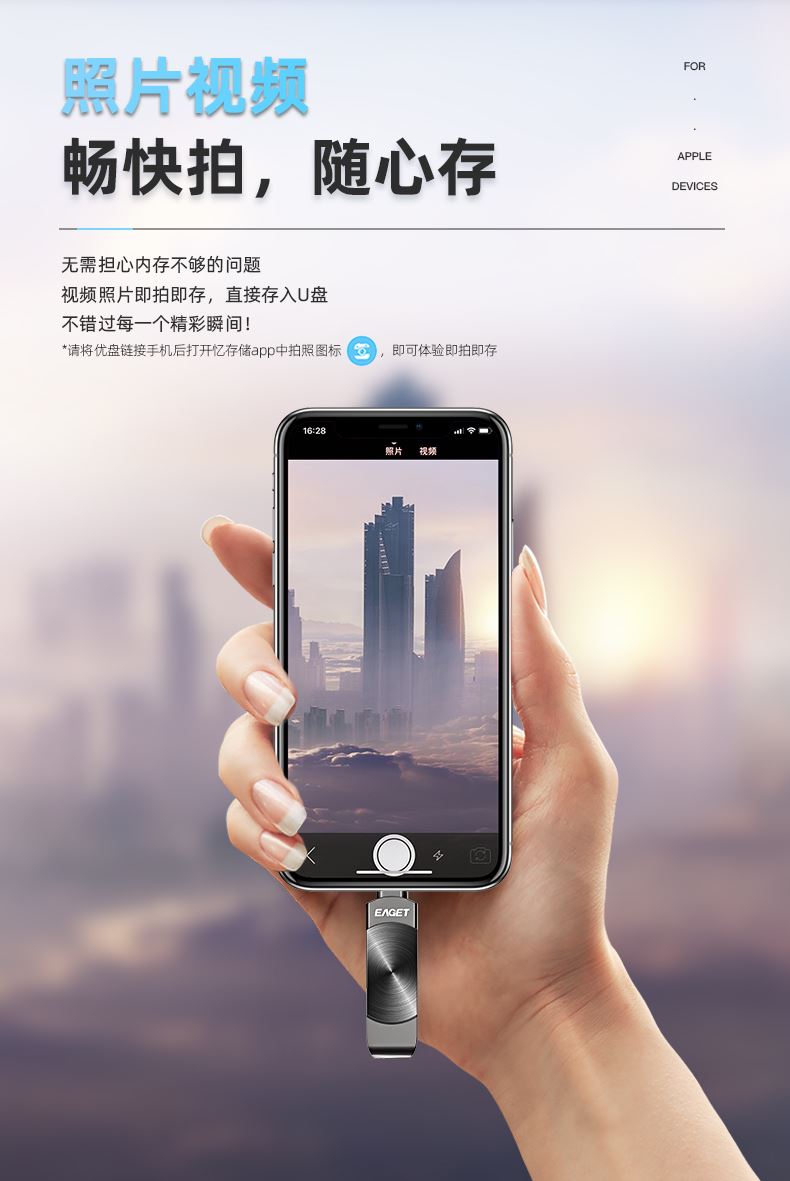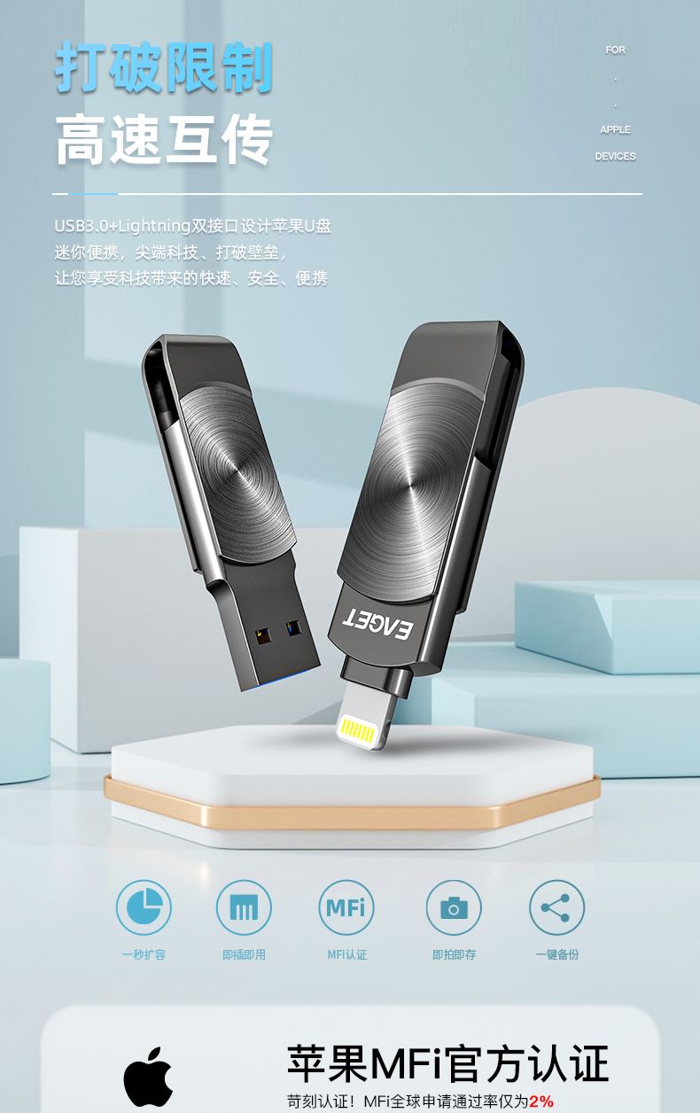 Lightning & USB-A 雙接口 全金屬設(shè)計(jì),質(zhì)感超群 雙接口設(shè)計(jì),支持Lightning & USB-A 雙接口傳輸 MFi蘋(píng)果認(rèn)證,廣泛兼容 一秒傳輸,輕松識(shí)別 專(zhuān)屬憶存儲(chǔ)APP,一鍵備份,即拍即存 小巧精致,隨身攜帶