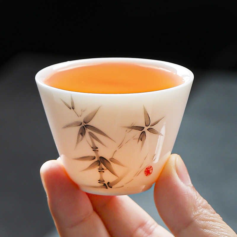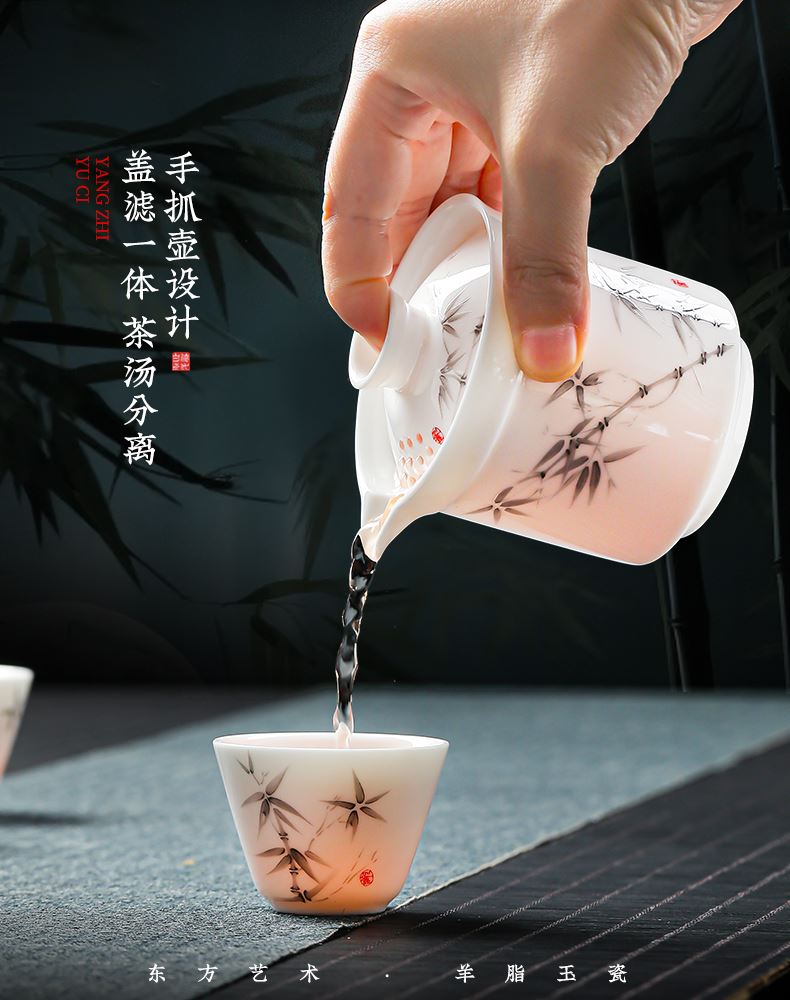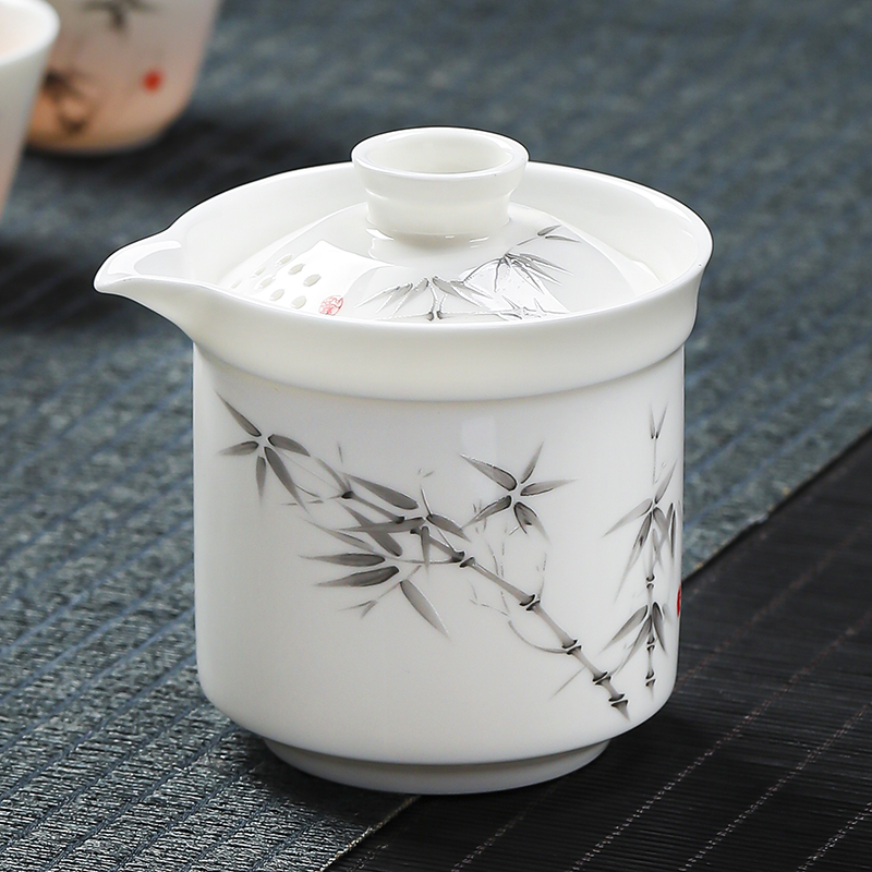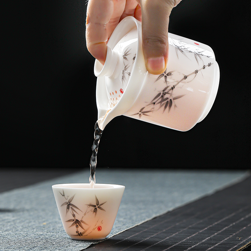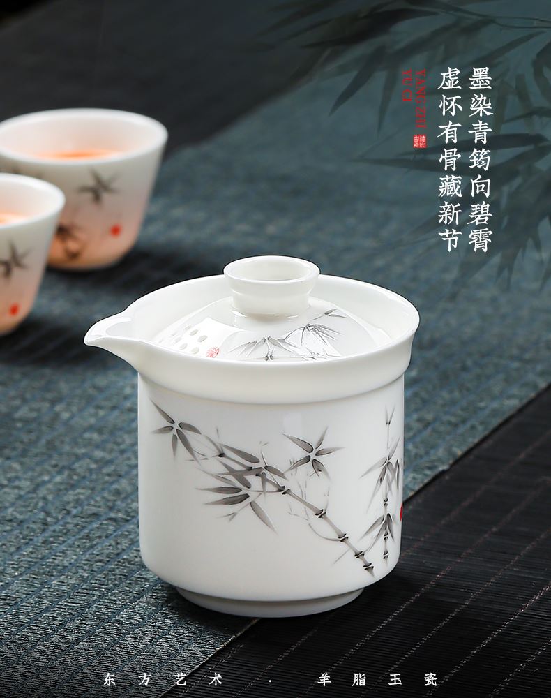 手抓壺1:9cm*9cm 180ml 茶杯3:5.6cm*4cm 39ml 旅行包1:11.5cm*11.5cm*11.5cm 優(yōu)質羊脂玉瓷,高溫燒制。瓷化強度高,不吸味,易清洗。 釉面光滑細膩,觸感溫潤如玉。潔白如雪,細膩通透。 墨竹圖案,簡約大氣,自帶風骨。 一體收納,攜帶方便,多場合可用。