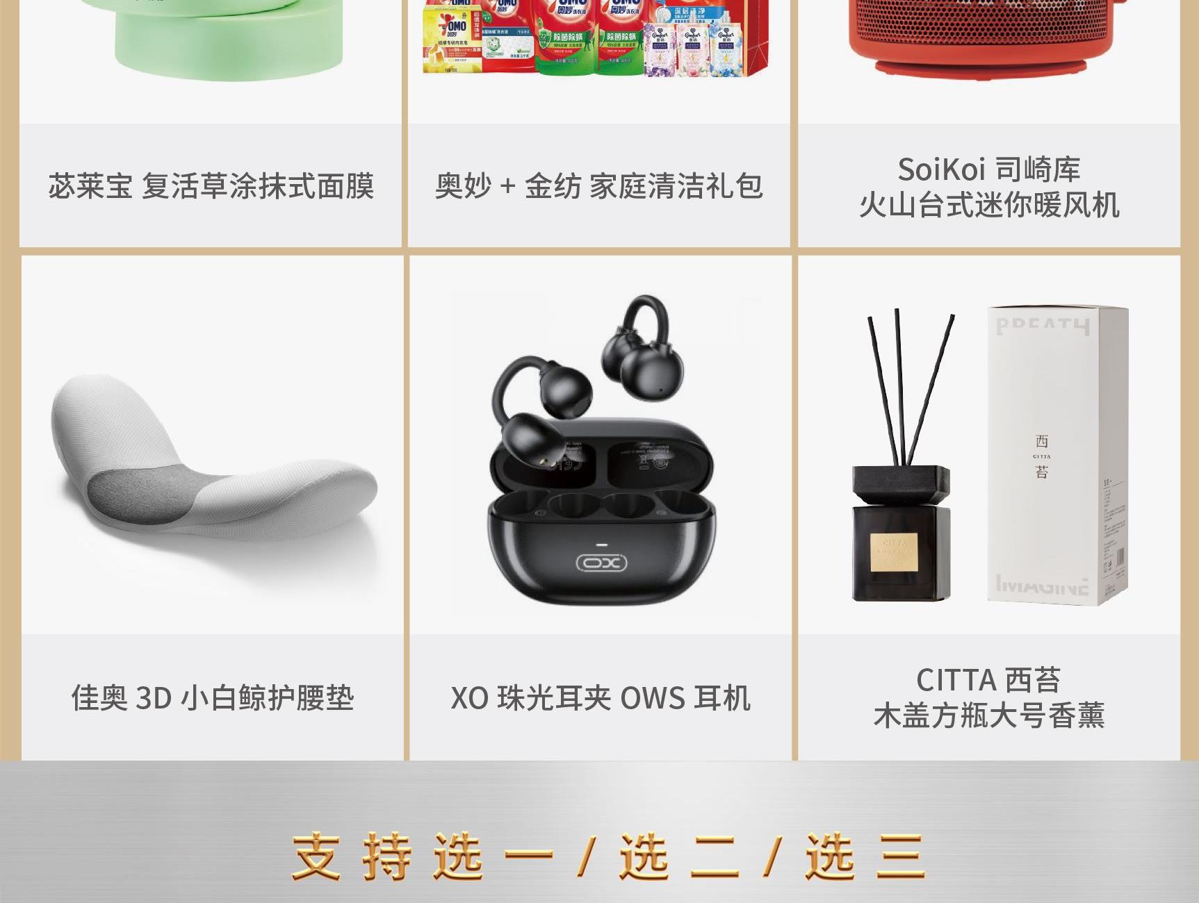 選項(xiàng)1 雀巢奇巧 巧克力禮盒裝 選項(xiàng)2 如水 堅(jiān)果禮盒 選項(xiàng)3 澳門永輝 糕點(diǎn)禮盒 選項(xiàng)4 小胡鴨 鹵味零食禮盒 選項(xiàng)5 潮跡 鮮牛匯組合 選項(xiàng)6 olayks立時(shí) 多功能養(yǎng)生壺 選項(xiàng)7 KENZO 多功能巾二件套 選項(xiàng)8 OTE歐堤 保溫咖啡杯 選項(xiàng)9 DUMIK中科德馬克 一人食系列錘紋小鐵鍋 選項(xiàng)10 Dear lrean獨(dú)特艾琳 夜櫻繁星浪漫悸動香氛禮盒 選項(xiàng)11 潔麗雅 采優(yōu)四件套 選項(xiàng)12 BRAUN博朗 剃須刀 選項(xiàng)13 Cath Kidston 倫敦巴士護(hù)手霜禮盒 選項(xiàng)14 Champion 休閑運(yùn)動腰包 選項(xiàng)15 苾?nèi)R寶 復(fù)活草涂抹式面膜 選項(xiàng)16 奧妙+金紡 家庭清潔禮包 選項(xiàng)17 XO 珠光耳夾OWS耳機(jī) 選項(xiàng)18 佳奧 3D小白鯨護(hù)腰墊 選項(xiàng)19 SoiKoi司崎庫 火山臺式迷你暖風(fēng)機(jī) 選項(xiàng)20 CITTA西苔 木蓋方瓶大號香薰