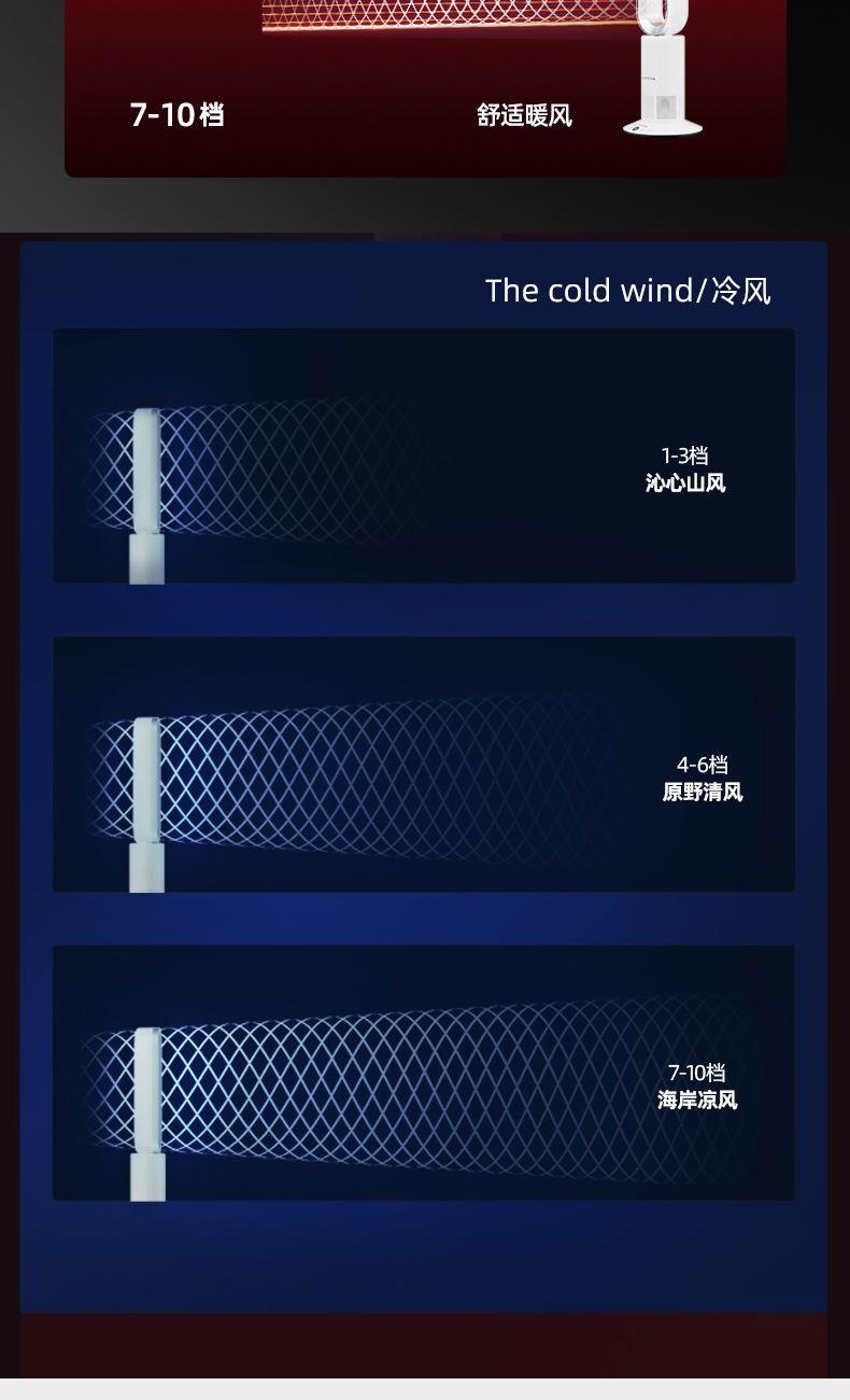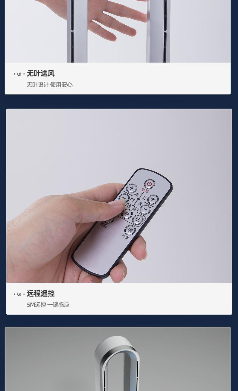 涼風(fēng)功率:35W 涼風(fēng)功率:1950W 額定電壓:220V~ 產(chǎn)品頻率:50Hz 產(chǎn)品凈重:3.4kg 產(chǎn)品毛重:4.6kg 裝 箱 數(shù):1臺(tái)/箱 冷/暖皆宜 觸屏/遙控雙操作,10擋冷風(fēng)/3擋暖風(fēng)隨心調(diào),9h遙控定時(shí),量身定制你的四季風(fēng); 120°柔風(fēng)大廣角久吹不頭疼,立體循環(huán)氣流,全屋空氣加速流通,倍感清涼; 風(fēng)大低噪直流無(wú)刷渦輪增壓電機(jī),風(fēng)感飽滿平穩(wěn),深夜吹風(fēng)不擾眠; 安全運(yùn)行跑道式外觀,無(wú)扇葉,不怕誤觸不夾手,減少安全隱患。