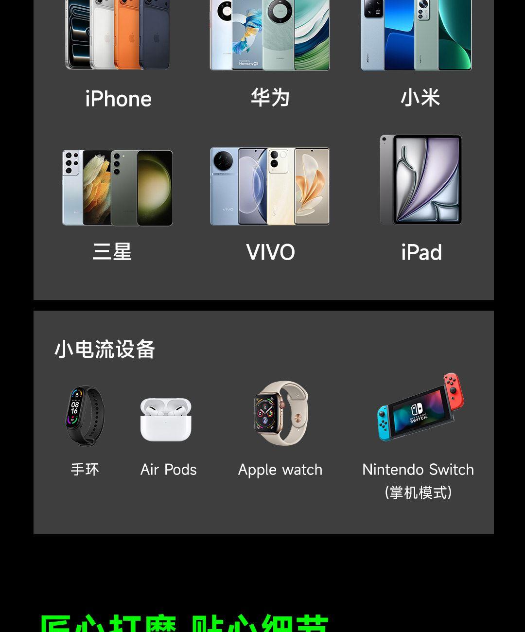 兼容華為FCP/SCP、三星AFC、QC、Apple 2.4A等快充協(xié)議,可同時支持三臺設(shè)備快速充電。