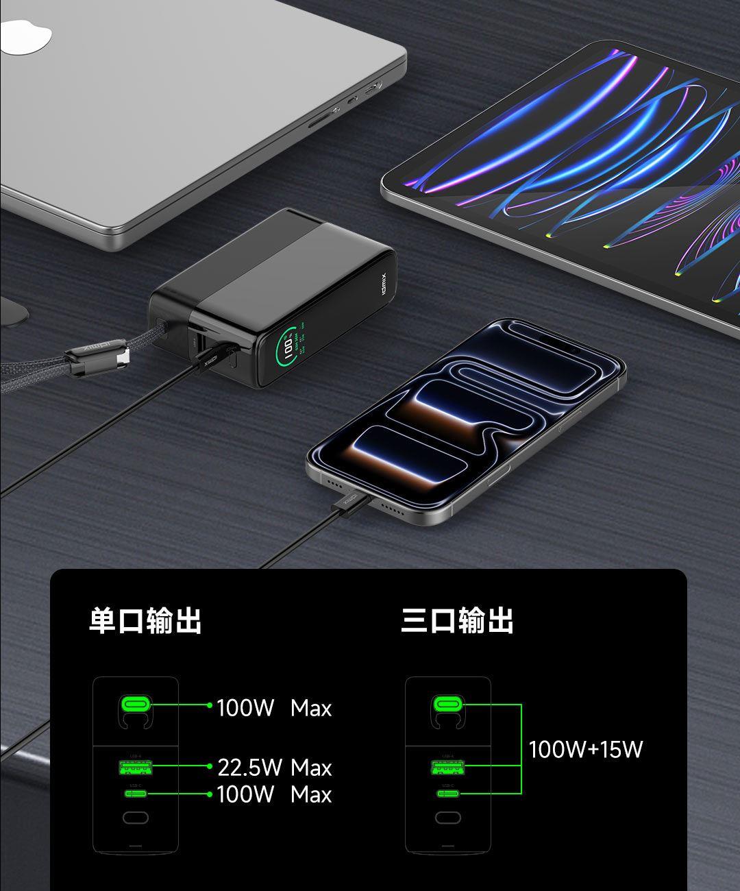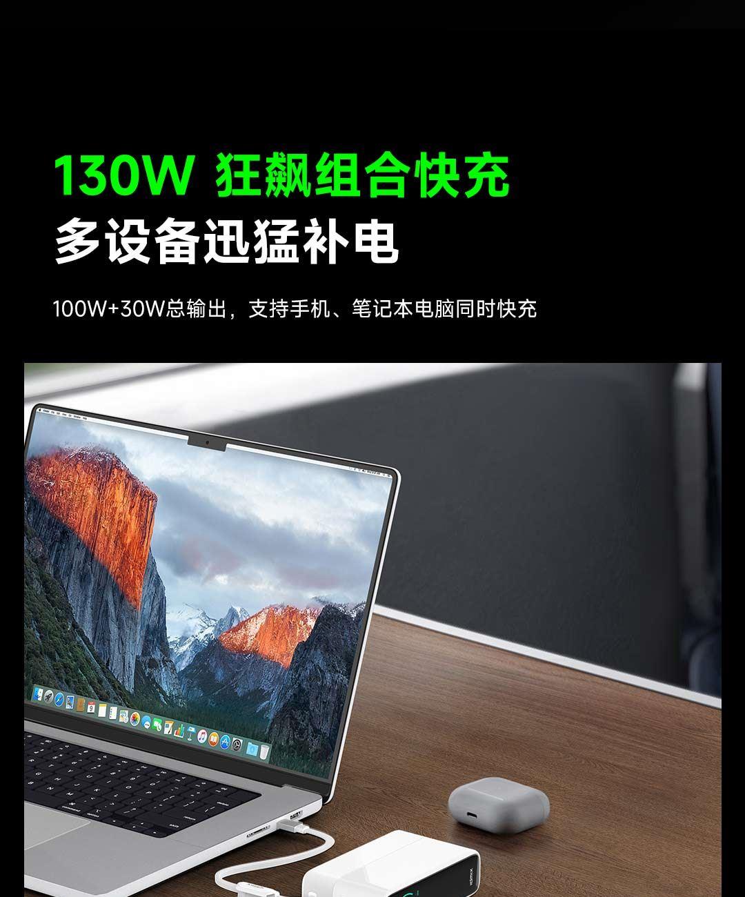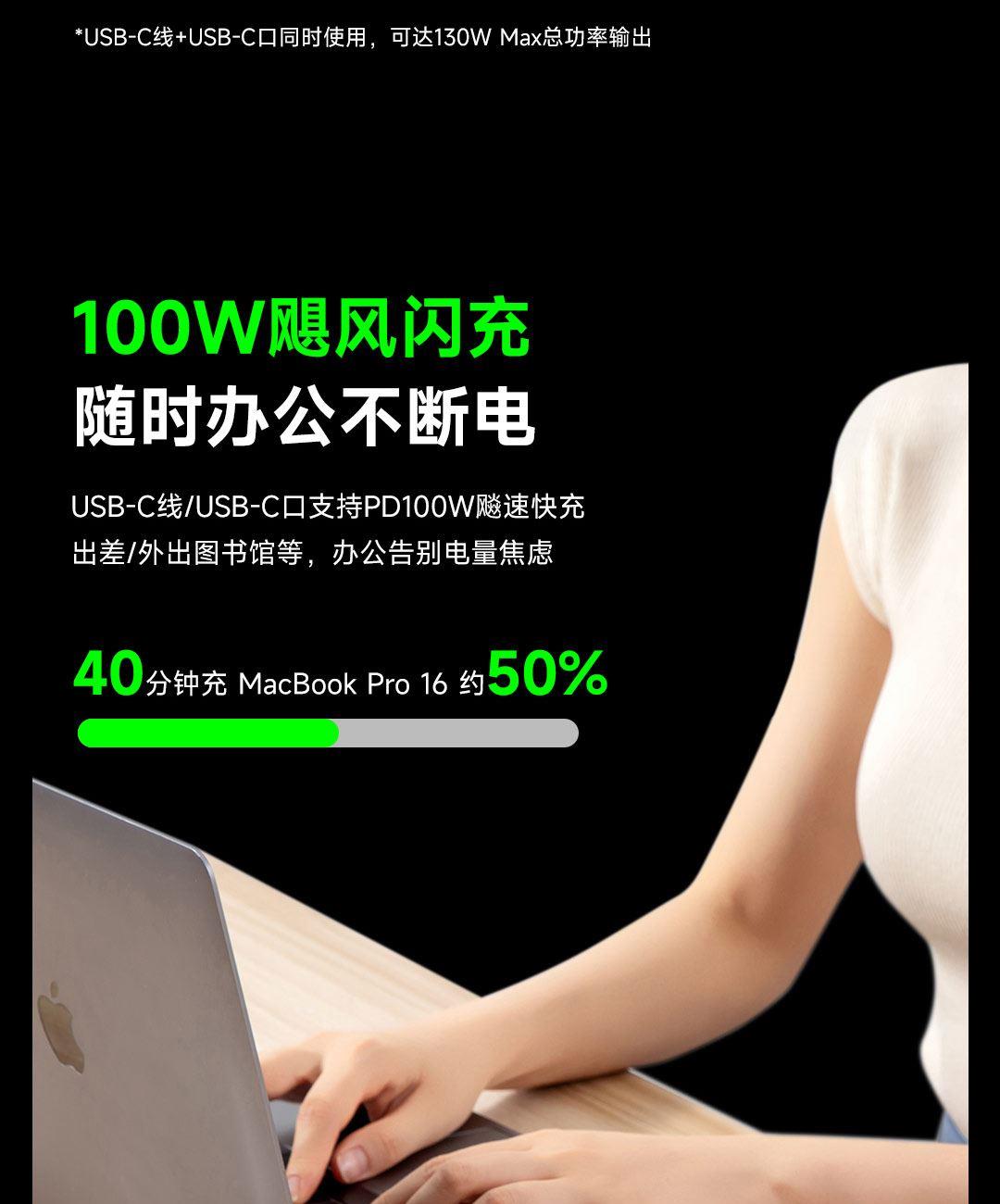 USB-C線+USB-C口同時使用,可達130W Max總功率輸出,USB-C線+USB-C口單獨使用時為100W輸出,USB-A口支持華為SCP/FCP快充協(xié)議,USB-C線/USB-C口支持60W自充輸入