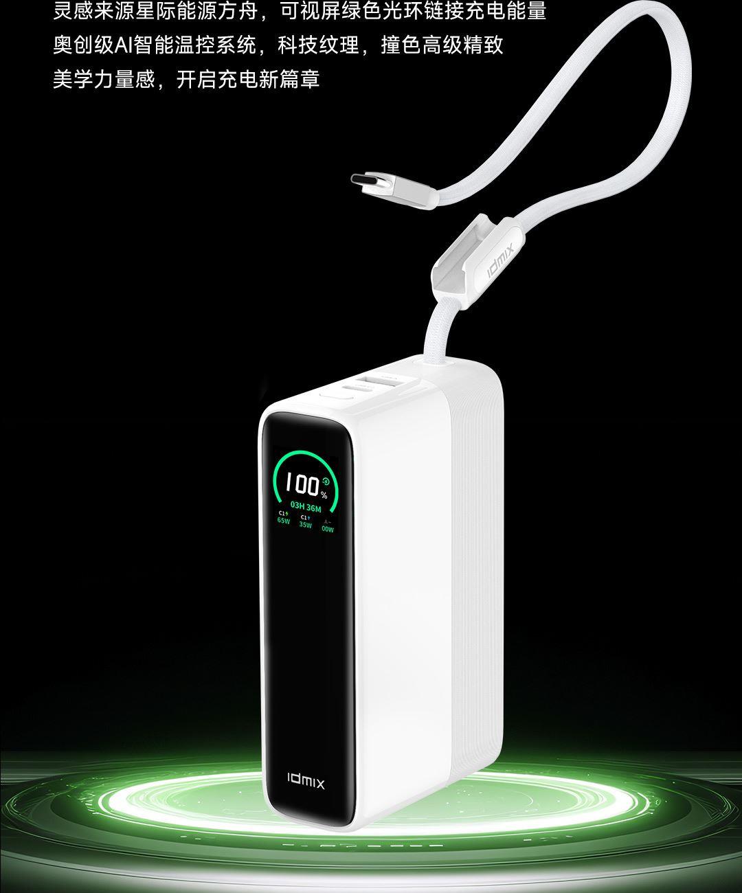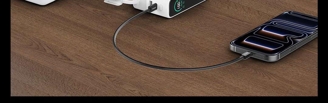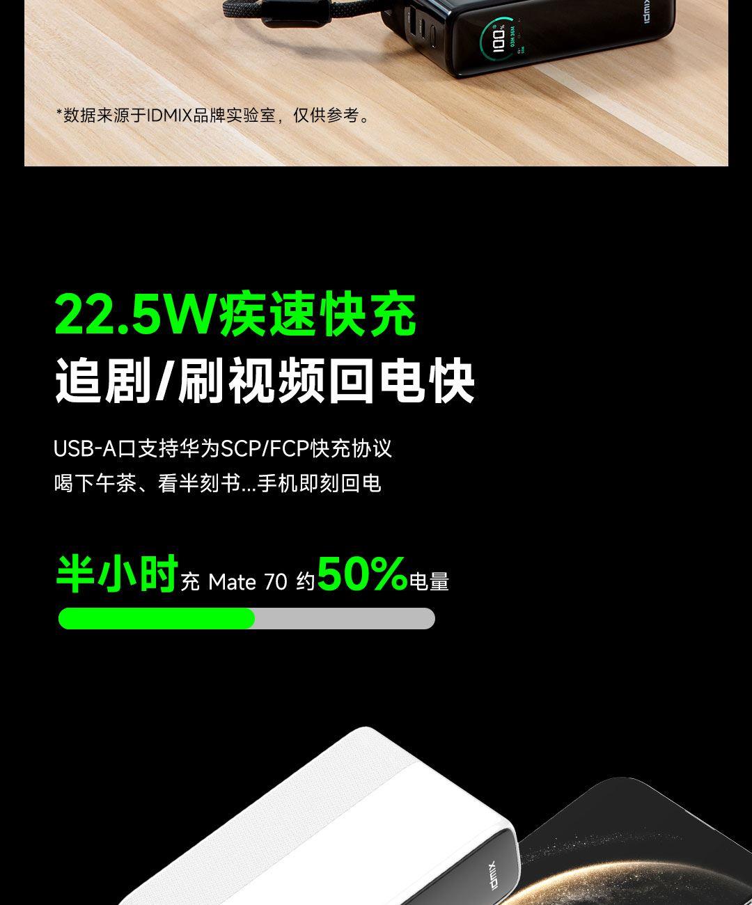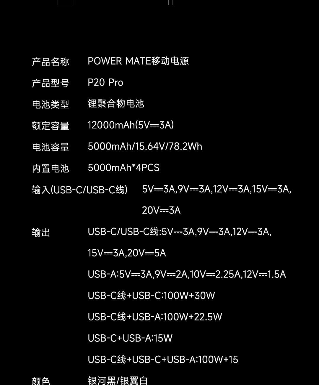USB-C線+USB-C口同時使用,可達130W Max總功率輸出,USB-C線+USB-C口單獨使用時為100W輸出,USB-A口支持華為SCP/FCP快充協(xié)議,USB-C線/USB-C口支持60W自充輸入