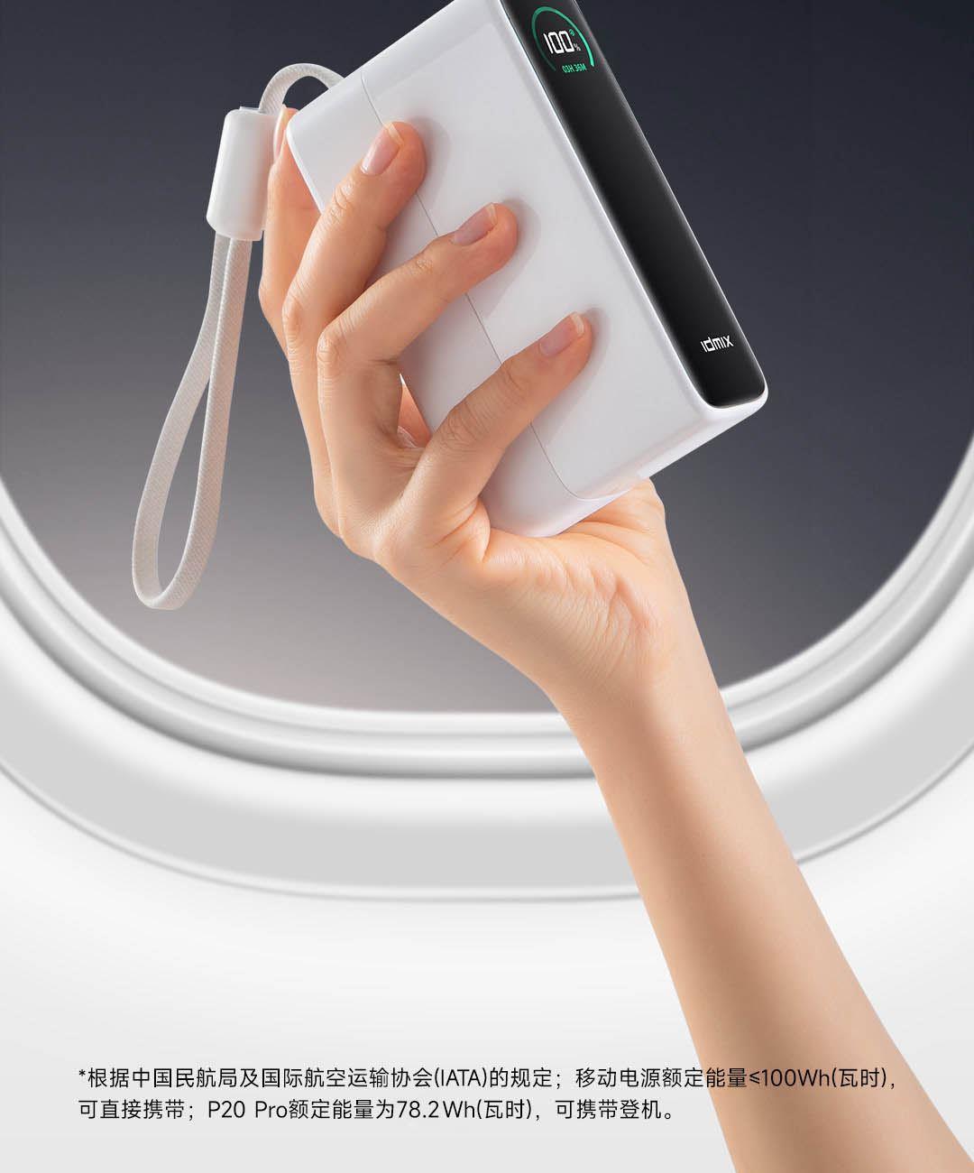 小巧體積,便攜出行,符合民航移動電源攜帶標準,額定能量為 72Wh(瓦時),可上飛機, 出國差旅輕松充電,