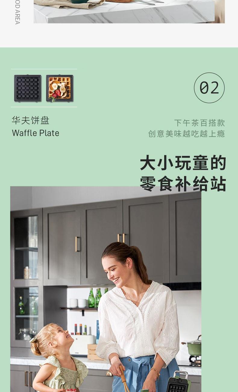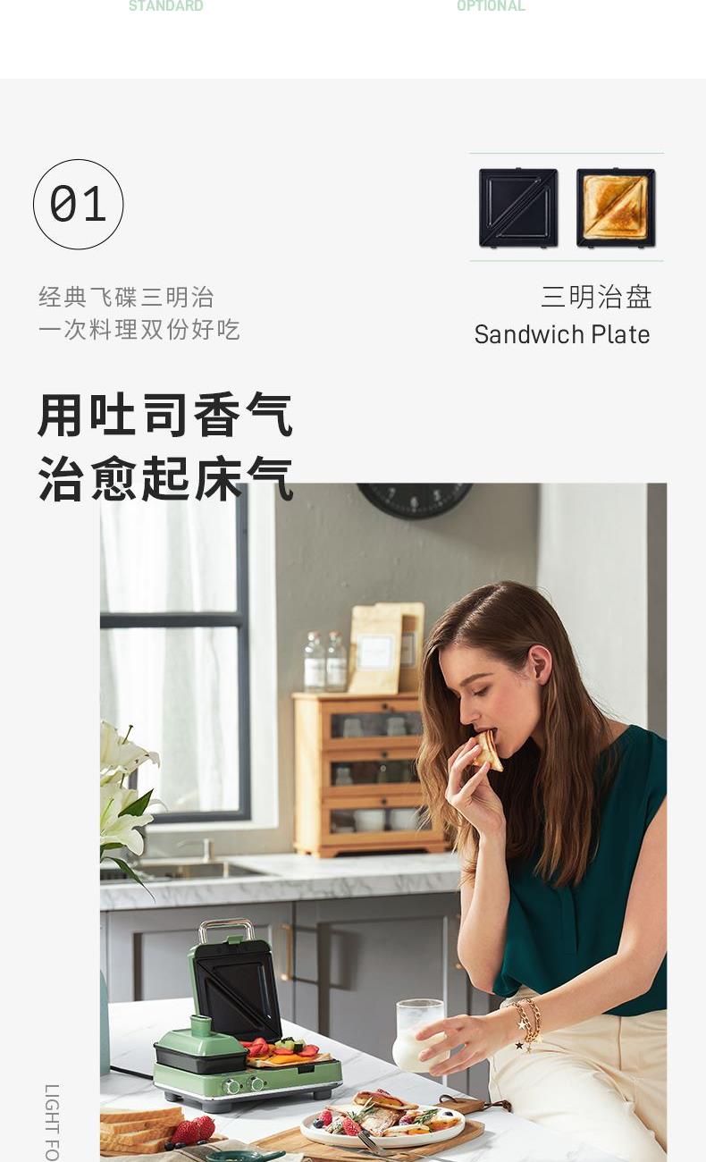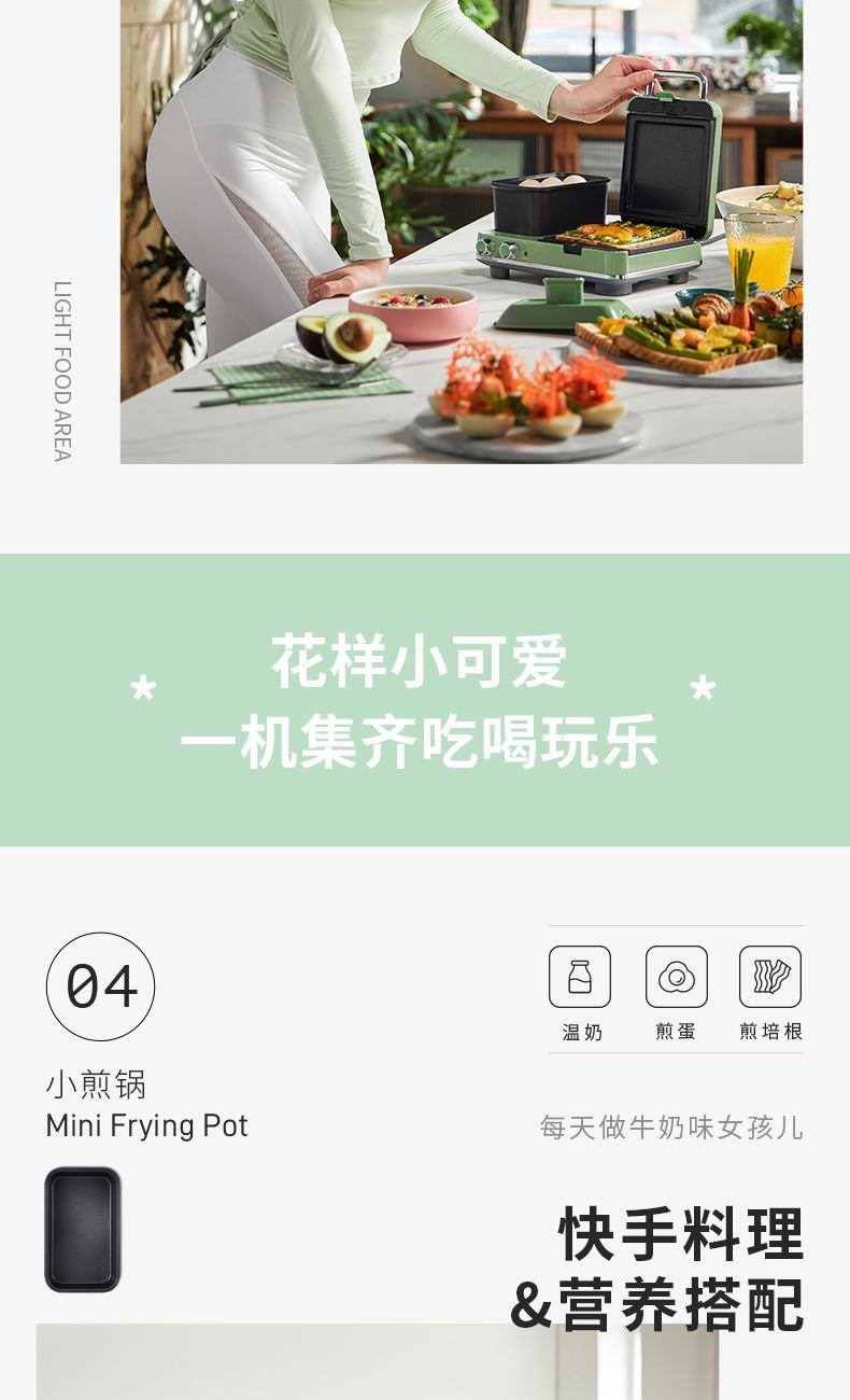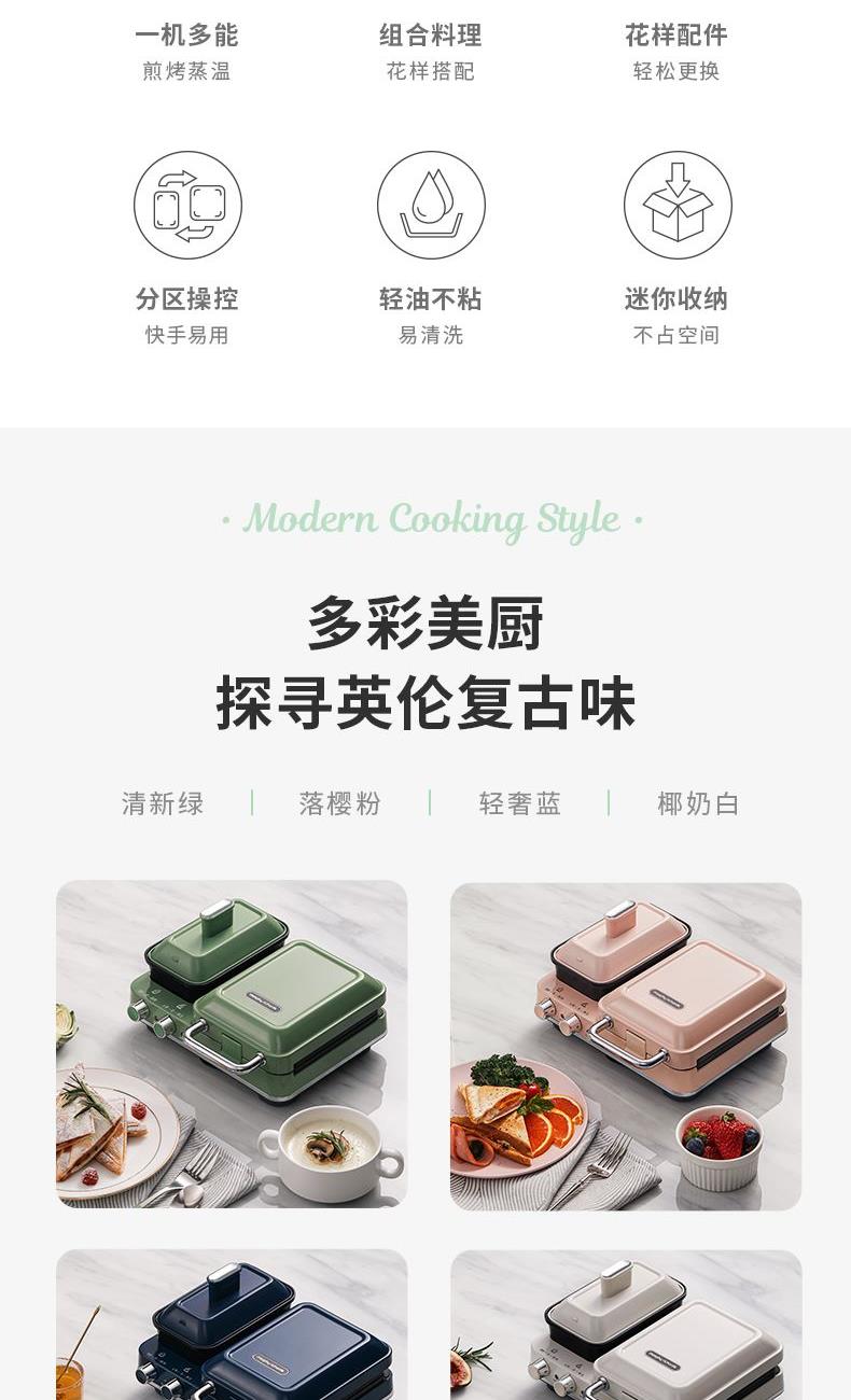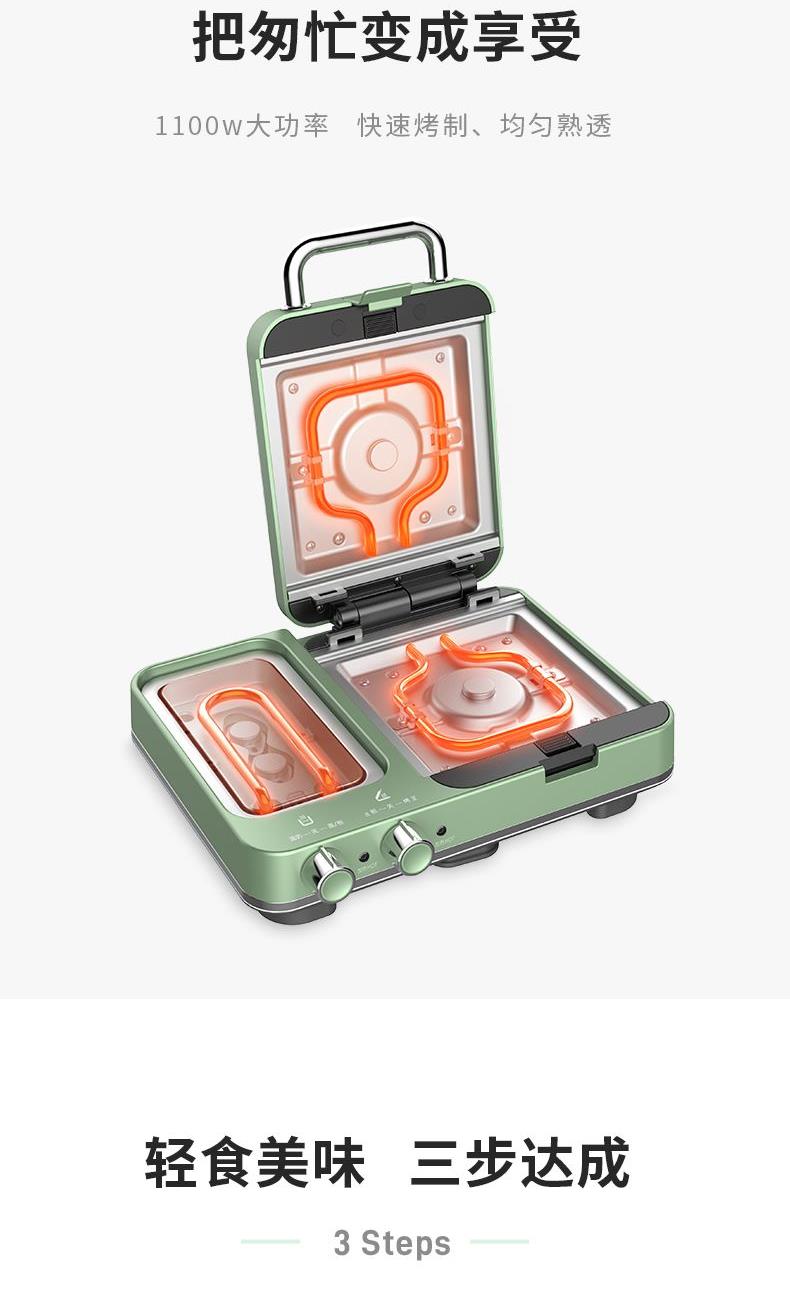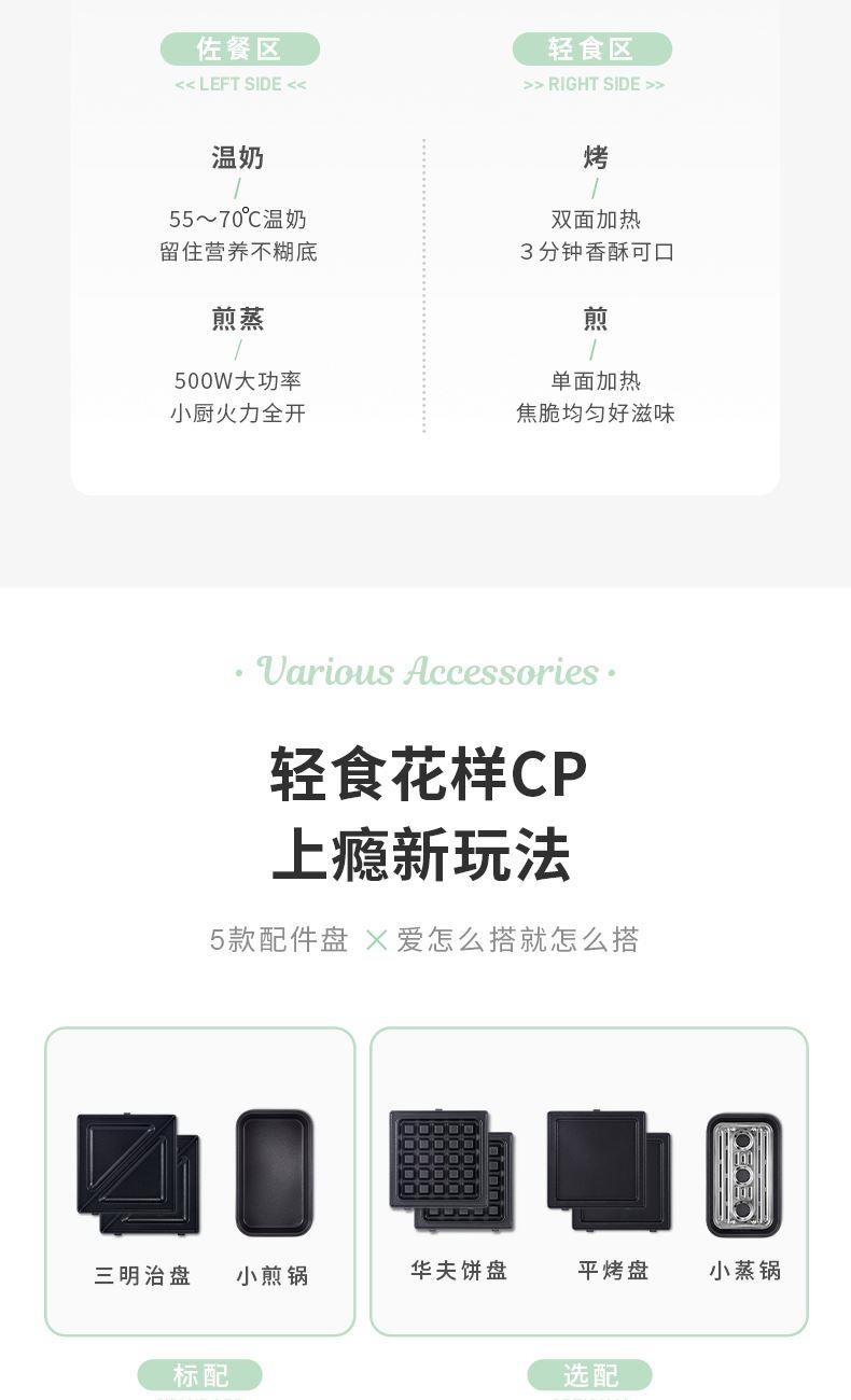 輕食早餐:具備三文治、華夫餅、蒸、煎、溫奶等多種功能 蒸煎烤多種功能配件選擇:采用壓鑄鋁底材,提高加熱效率,受熱均勻、可拆易換、清洗方便!
