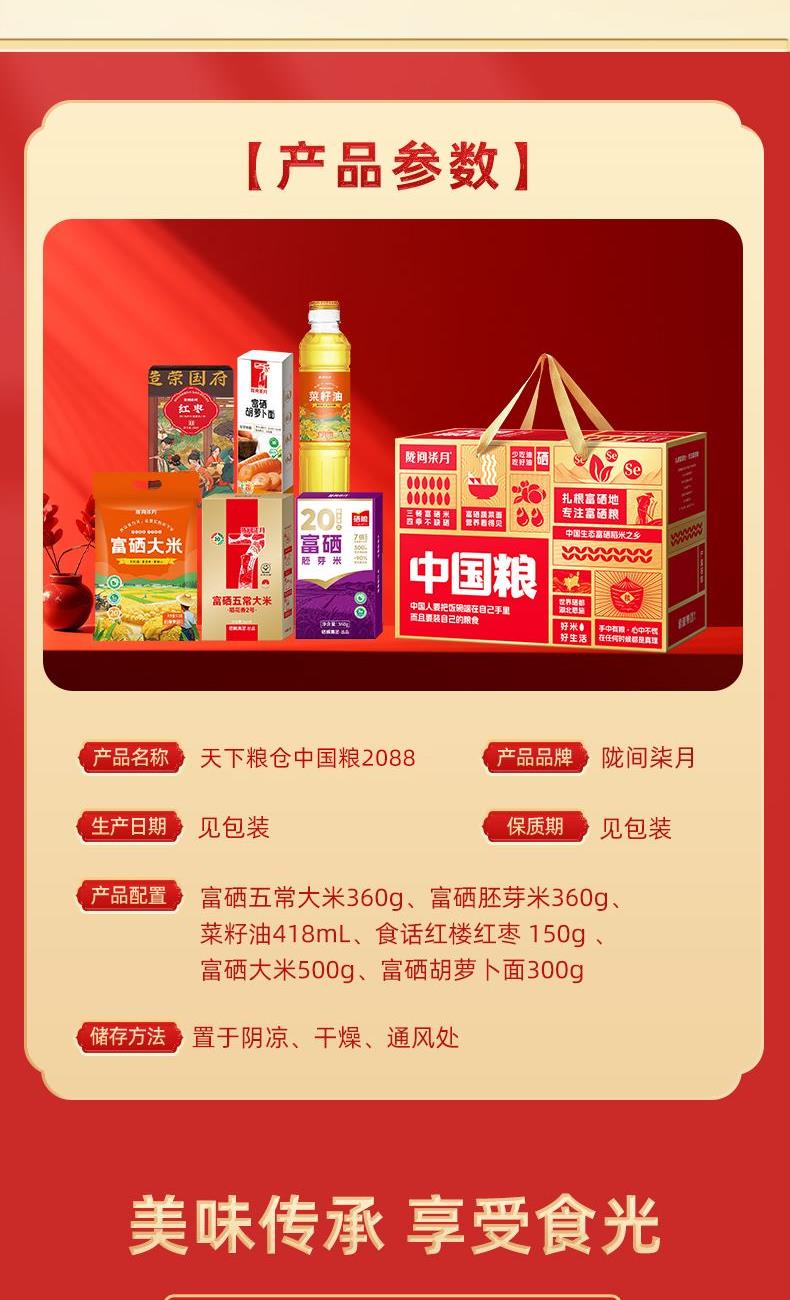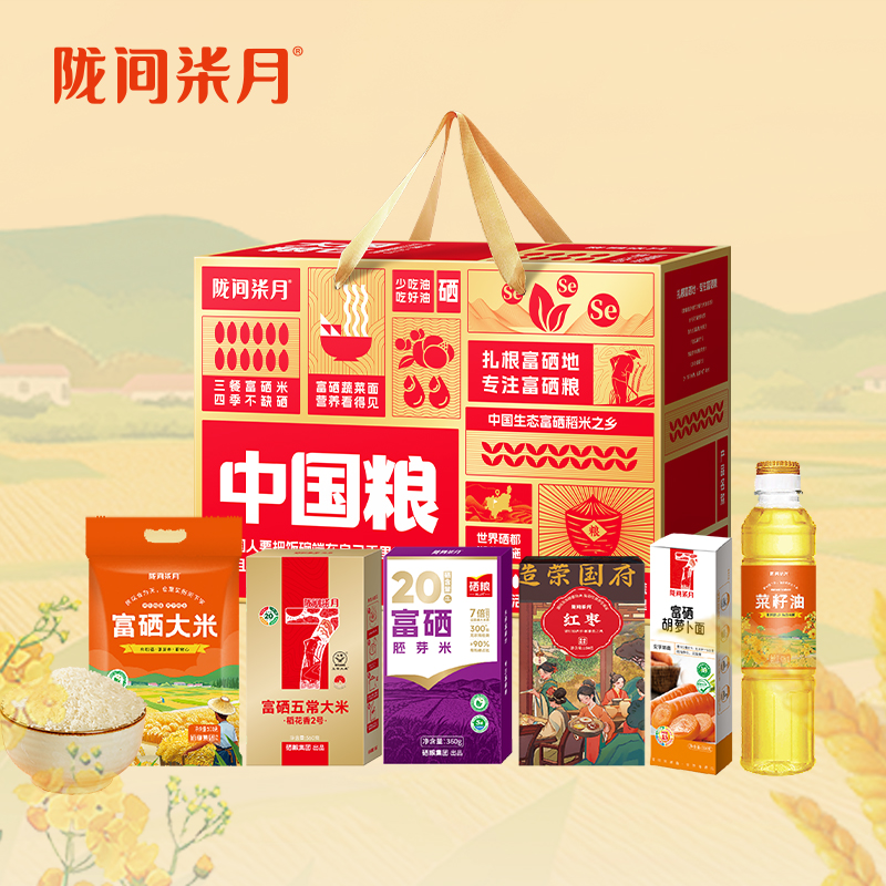 規(guī) 格:富硒五常大米360g、富硒胚芽米360g,菜籽油418mL,食話紅樓紅棗 150g ,富硒大米500g,富硒胡蘿卜掛面300g
