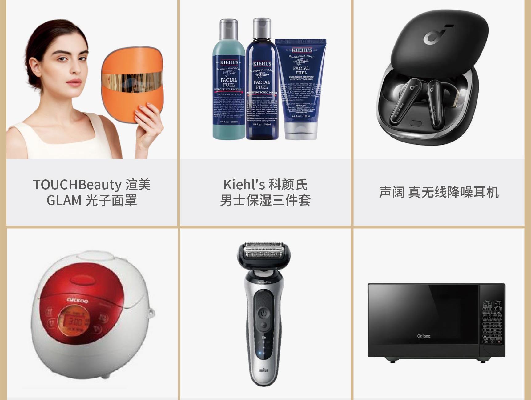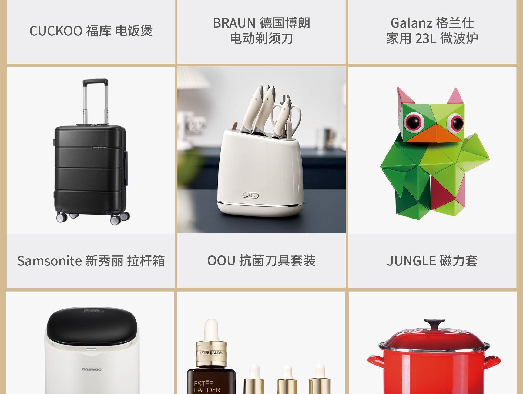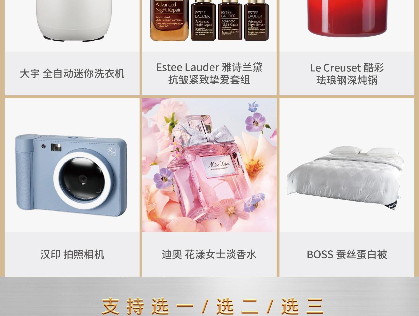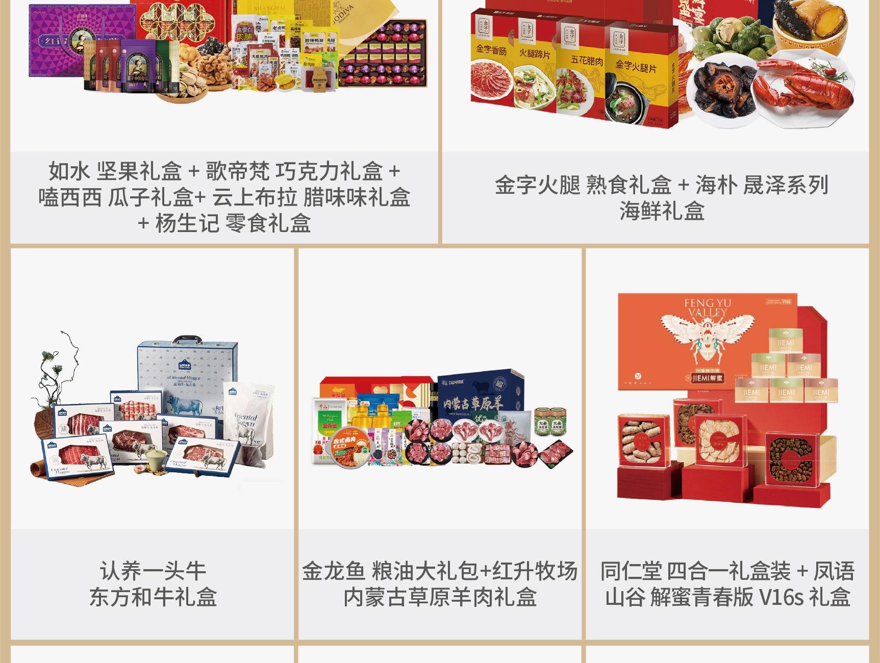 選項1 如水 堅果禮盒+歌帝梵 巧克力禮盒+嗑西西 瓜子禮盒+楊生記 零食禮盒 選項2 金字火腿 熟食禮盒+海樸 晟澤系列海鮮禮盒 選項3 認養(yǎng)一頭牛 東方和牛禮盒 選項4 紅升牧場 內蒙古草原羊肉禮盒+金龍魚 糧油大禮包 選項5 同仁堂 四合一禮盒裝+鳳語山谷 解蜜青春版V16s禮盒 選項6 TOUCHBeauty渲美 GLAM光子面罩 選項7 Kiehl's科顏氏 男士保濕三件套 選項8 聲闊 真無線降噪耳機 選項9 CUCKOO福庫 電飯煲 選項10 BRAUN德國博朗 電動剃須刀 選項11 Galanz格蘭仕 家用23L微波爐 選項12 Samsonite新秀麗 拉桿箱 選項13 OOU 刀具套裝 選項14 JUNGLE 磁力套 選項15 大宇 全自動迷你洗衣機 選項16 Estee Lauder 雅詩蘭黛 抗皺緊致?lián)磹厶捉M 選項17 漢印 拍照相機 選項18 Le Creuset酷彩 琺瑯鋼深燉鍋 選項19 迪奧 花漾女士淡香水 選項20 BOSS 蠶絲蛋白被
