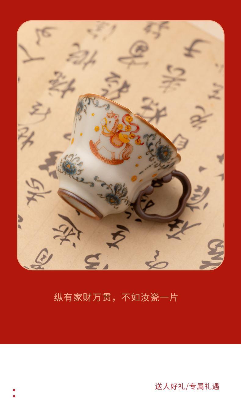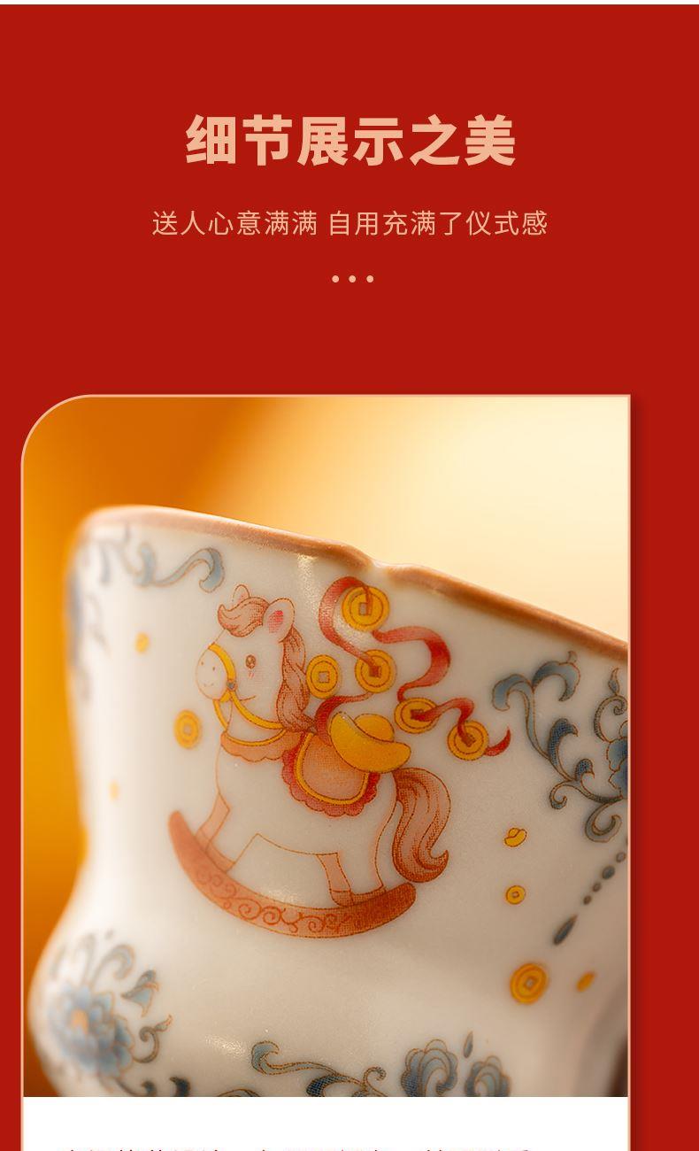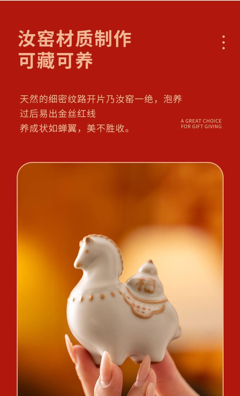 配 制:1杯 1碟 1擺件 1禮盒 手提袋 材質(zhì):汝黃瓷 規(guī)格:杯子 6*9cm 碟子直徑9.3cm高1.8cm 擺件9.3*7cm 容量:70ml 推薦說明:馬年開門紅禮品,馬上有錢,馬到成功杯子擺件套裝,馬背上葫蘆造型,寓意福祿。亞黃汝瓷,瑪瑙入釉,蟬翼開片,家有千財(cái)萬貫,不如汝窯一片。技術(shù)新品。畫面堆料技術(shù),富有立體浮雕質(zhì)感,真實(shí)感強(qiáng)。杯身開片,可養(yǎng)瓷。